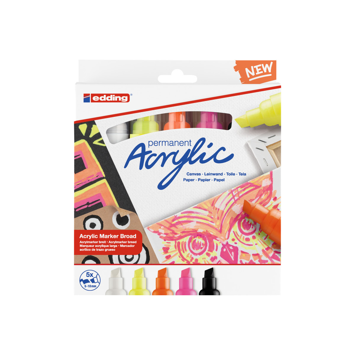 Make your artwork pop with edding 5000 Series Acrylic Markers, Broad Tip, Neon Colors, Set of 5. These high-quality acrylic paint markers deliver bold, opaque coverage with brilliant neon intensity on a wide range of surfaces, including canvas, paper, wood, stone, and metal. The broad chisel tip allows for dynamic strokes and smooth color application, ideal for backgrounds, lettering, and expressive designs. The highly pigmented, water-based acrylic ink dries quickly to a matte finish and resists fading over time. The set includes five vibrant neon colors perfect for creating eye-catching effects in art, signage, and décor projects. edding 5000 Series markers provide professional-quality color performance for both artists and students.