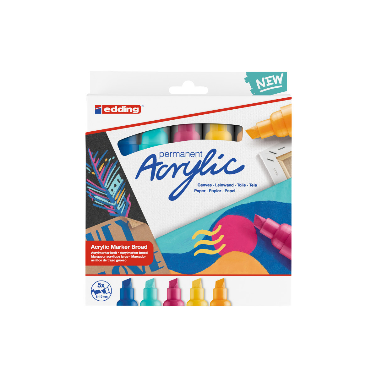Explore bold, expressive creativity with edding 5000 Series Acrylic Markers, Broad Tip, Abstract Colors, Set of 5. Designed for artists and crafters, these premium paint markers feature a broad chisel tip that delivers smooth, opaque strokes perfect for layering, shading, and bold mark-making. The highly pigmented, water-based acrylic ink adheres beautifully to canvas, wood, paper, stone, and metal—drying quickly to a durable matte finish. The abstract-inspired palette includes five contemporary hues ideal for modern artwork, mixed-media projects, and design exploration. With a shake-and-pump system for consistent ink flow, edding 5000 Series markers combine professional performance with user-friendly control, giving artists the freedom to express bold ideas across multiple surfaces