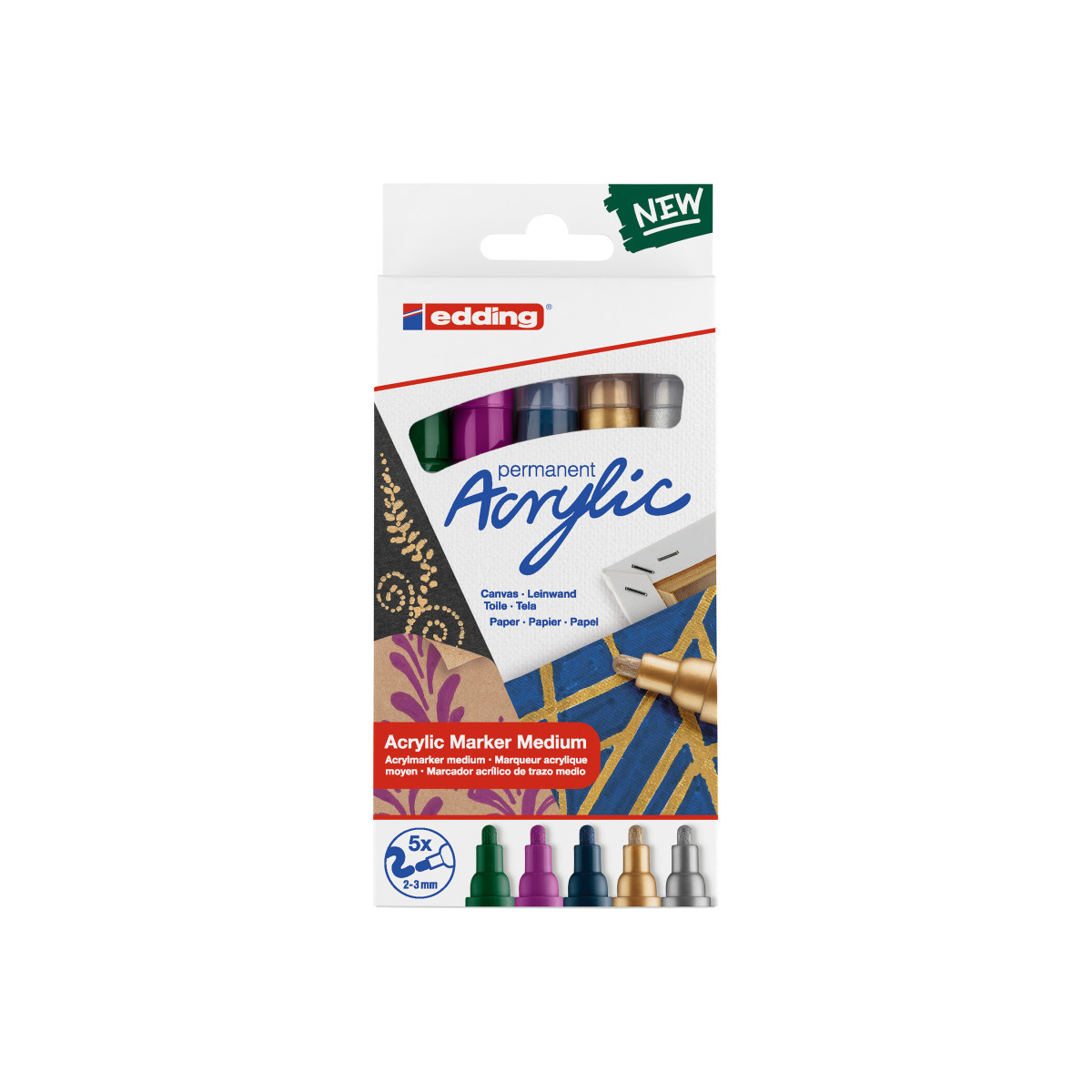 Celebrate creativity year-round with edding 5100 Series Acrylic Paint Markers, Medium Tip, Festive Colors, Set of 5. Designed for precision and performance, these medium bullet-tip markers provide smooth, even color application on canvas, wood, paper, stone, and metal. The highly pigmented, water-based acrylic ink produces brilliant, opaque color with a matte finish that resists fading and smudging. The festive 5-color palette includes metallic-inspired and vibrant seasonal hues perfect for holiday crafts, signage, and decorative artwork. Ideal for classrooms, studios, and creative professionals, edding 5100 Series markers offer consistent ink flow, quick-drying performance, and lasting durability—bringing a joyful sparkle and professional-quality finish to every artistic project.
