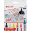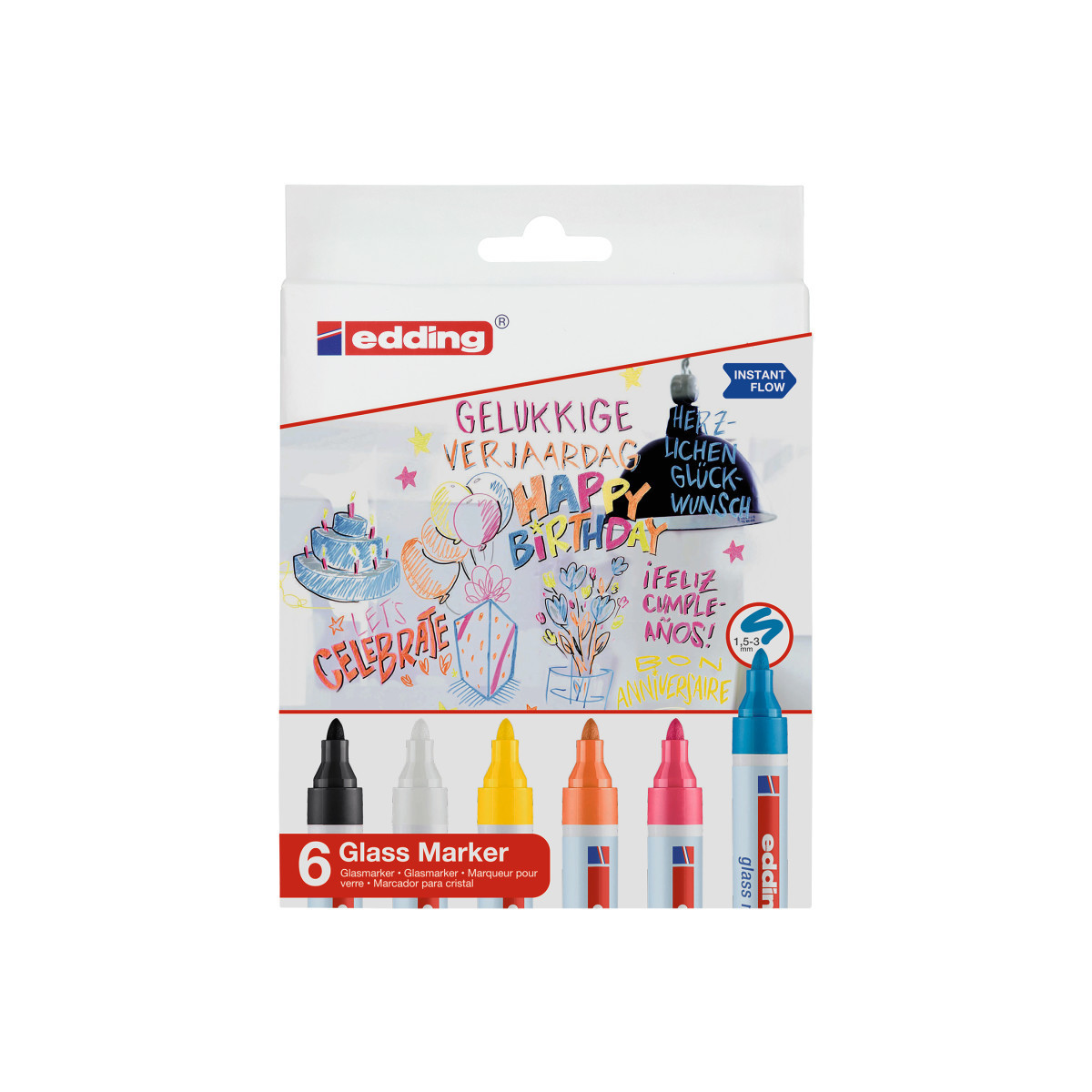 Write, draw, and decorate with brilliant color using edding 95 Series Glass Markers, Assorted Colors, Set of 6. These versatile markers feature medium bullet tips that create smooth, even lines ideal for writing, sketching, or adding flair to glass, mirrors, and other glossy surfaces. The water-based liquid ink provides vibrant, opaque color that dries quickly and can be wiped away easily with a damp cloth—perfect for classrooms, signage, and seasonal displays. The assorted 6-color set includes bright, eye-catching hues for creative variety. Low-odor and easy to use, edding 95 Series glass markers deliver excellent coverage, clarity, and control, making them a reliable choice for artists, teachers, and creative professionals.
