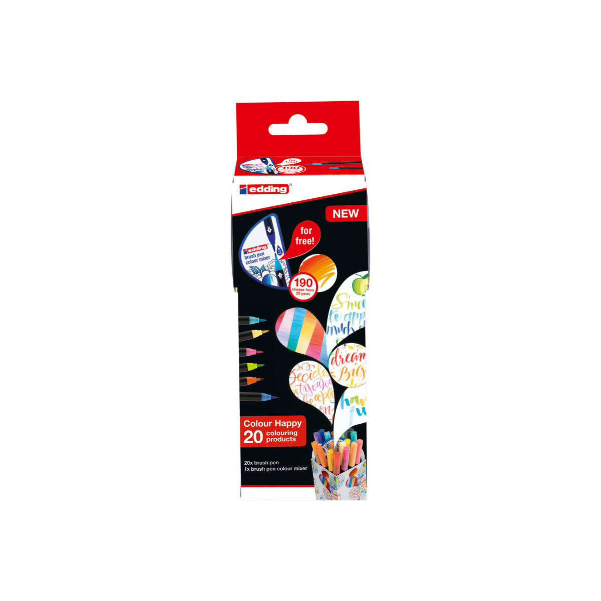 Unleash your creativity with edding Color Happy Brush Pens, Assorted Colors, Set of 20. Designed for versatility and expression, these high-quality pens feature flexible brush tips that allow for both fine detail and broad strokes—perfect for hand lettering, illustration, journaling, and coloring. The water-based ink provides vibrant, blendable color that can be used alone or mixed for watercolor effects. Each pen delivers consistent flow and smooth application, ideal for students, artists, and hobbyists. This complete 20-color set includes a rich spectrum of hues conveniently stored in a durable box for easy organization. edding Color Happy Brush Pens combine precision, comfort, and professional-grade pigment for colorful, creative expression in any art or craft project.