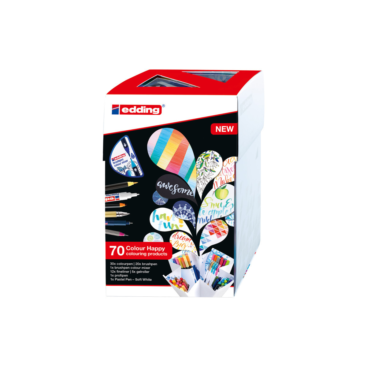Experience endless creative possibilities with the edding Color Happy Big Box, Assorted Colors, Mixed Coloring Set of 70. This all-in-one creative collection includes a vibrant assortment of brush pens, fineliners, and accessories designed for drawing, lettering, coloring, and illustration. The flexible brush tips allow expressive strokes, while the precision fineliners deliver detailed, clean lines—perfect for blending, shading, and outlining. Each pen features water-based ink that produces brilliant, blendable color ideal for both beginners and experienced artists. The durable case keeps all 70 pieces neatly organized for easy access at home, in classrooms, or on the go. edding Color Happy sets combine quality, versatility, and color harmony—everything needed for modern creative expression and artistic exploration.