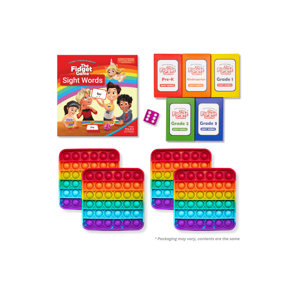 The Fidget Game is a fun, hands-on way for kids in Pre-K to Grade 3 to master essential sight words and become confident, fluent readers. Aligned with the Science of Reading, Common Core, B.E.S.T., and TEKS standards, this interactive game helps children recognize, pronounce, spell, and master 220 high-frequency Dolch sight words through play-based learning.