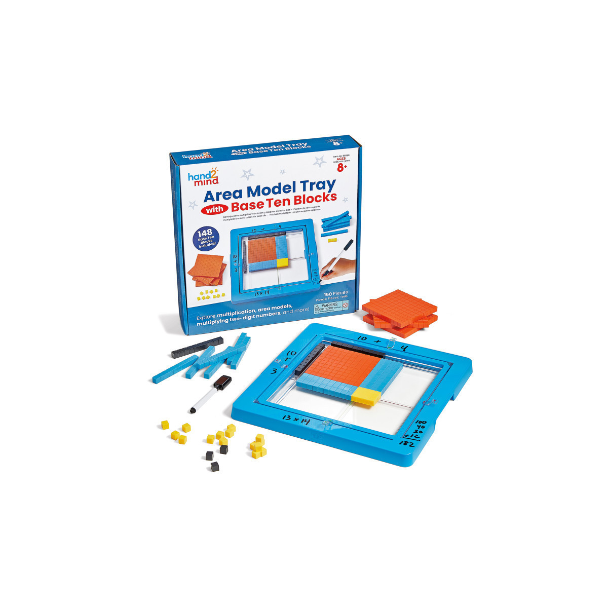 - Includes 1 Base Ten Area Model Tray, 148 Differentiated Base Ten Blocks (4 Flats, 20 Rods, 100 Units, 4 Rods, 20 Units), 1 Dry-Erase Marker, and 1 Activity Guide.