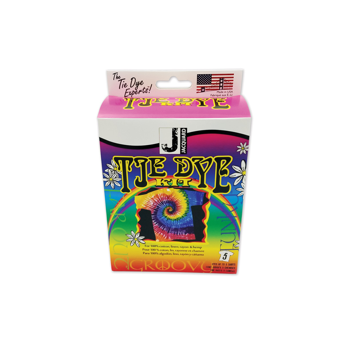 Bring back the psychedelic '60s with this groovy tie-dye kit. Find a T-shirt or some old jeans and embellish them with bold splashes and feathery, rainbow swirls of color. This kit will dye up to 5 shirts in brilliant funkadelic colors. Professional-quality fiber-reactive dyes are combined with easy, illustrated instructions to ensure fabulous results. The kit includes premeasured fuchsia, yellow and turquoise dyes in 3 no-mess applicator bottles. Illustrated comic-book-style instructions include descriptions of 4 tie-dye techniques. The kit also includes vinyl gloves, a bag of soda ash, and a handful of rubber bands. All you need is warm water to mix the dye, a garment, and a bucket or sink. The garment must soak in the soda ash for 20 minutes before you dye it. After you're done, set the garment aside for 24 hours before rinsing, washing and drying it. Then wear your groovy garment with pride. For all ages, with adult supervision. Made in the USA. For over 30 years, Jacquard has been the leading manufacturer of artist quality textile, mixed media and craft products