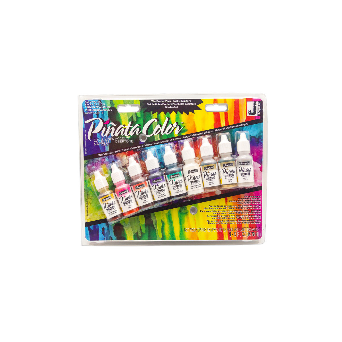 Enhance your alcohol ink art with luminous metallics and shimmering tints using the Jacquard Piñata Color Overtones Exciter Pack. This specialty set includes a selection of metallic and pearlized alcohol inks formulated with premium pigments for brilliant reflective effects on non-porous surfaces. The Overtones Exciter Pack features nine metallic and pearlescent colors, perfect for use on glass, metal, resin, ceramic, plastic, and Yupo paper. These fast-drying, acid-free inks create dazzling highlights and iridescent depth in paintings, resin art, jewelry, and mixed-media work. Jacquard Piñata Colors deliver professional-grade quality, exceptional vibrancy, and endless creative potential for artists and crafters seeking dynamic metallic effects.