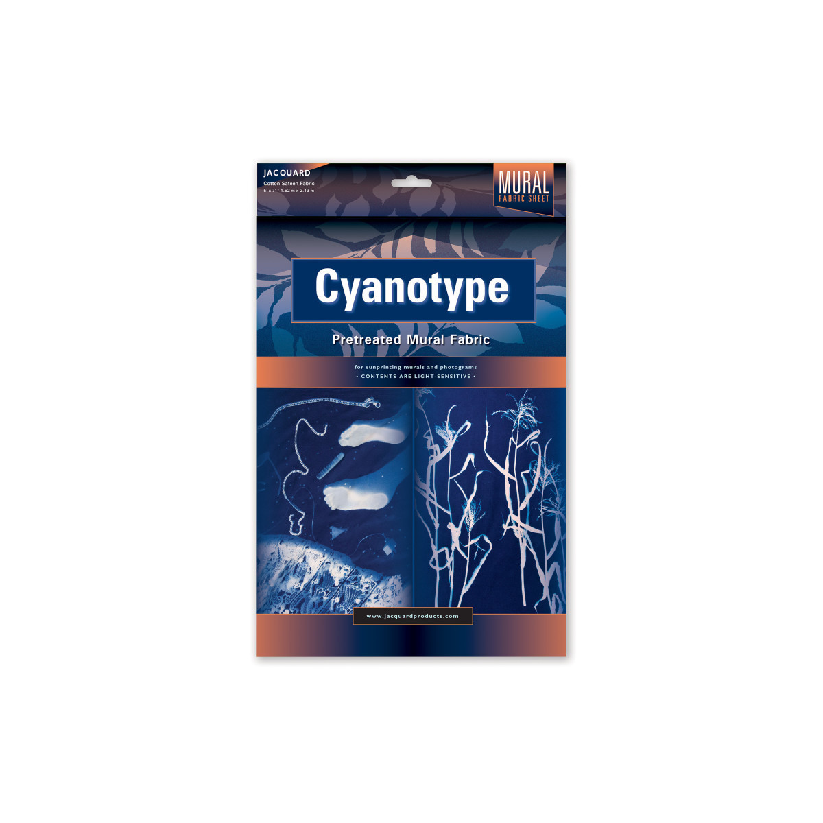 Create large-scale photographic prints with ease using the Jacquard Pretreated Cyanotype Mural Fabric, 5' x 7'. This oversized 100% cotton fabric comes pre-coated with light-sensitive cyanotype solution, ready to expose right out of the package. Simply place objects, film negatives, or transparencies on the surface, expose it to sunlight or UV light, and rinse with water to develop deep Prussian blue images. Perfect for collaborative classroom projects, art installations, or fine art prints, this mural-size fabric allows artists to explore composition, scale, and light in a hands-on way. No chemical mixing or special setup required, just sunlight and creativity. Jacquard Pretreated Cyanotype Fabric delivers professional-quality, archival results for artists, educators, and photographers alike.