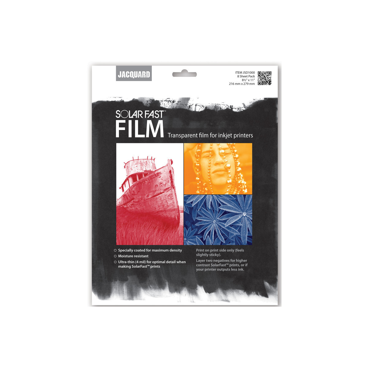 Create crisp, detailed photographic negatives for sunlight printing with Jacquard SolarFast Film, 8-Sheet Pack. Specially designed for use with SolarFast Dyes and other light-reactive printing processes, this high-quality transparency film allows artists and photographers to produce digital negatives using standard inkjet printers. Each sheet provides excellent ink density and clarity, ensuring sharp, high-contrast images and consistent UV exposure. Ideal for alternative photography, screen printing, cyanotype, and photo-transfer techniques, SolarFast Film enables precise control over tonal range and exposure detail. Perfect for classroom, studio, or home use, Jacquard SolarFast Film makes it easy to turn digital images into beautiful, permanent prints on fabric, paper, or other light-sensitive surfaces.