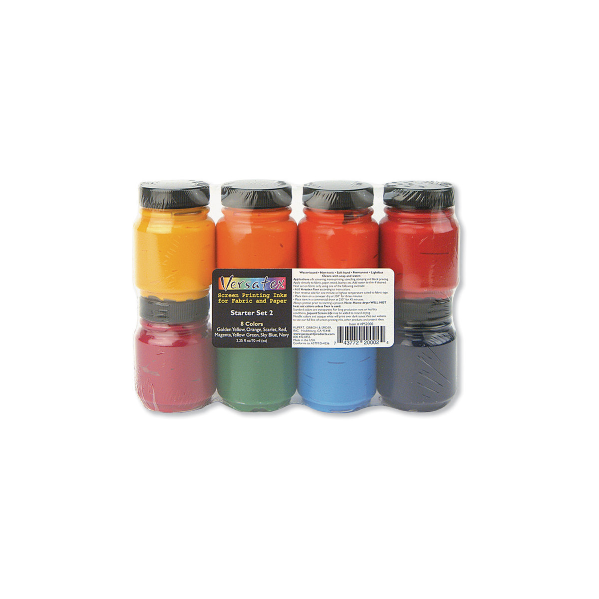 Experience professional textile printing with the Jacquard Versatex Screen Printing Ink Starter, Set #2, Set of 8. These rich, water-based inks are formulated for superior coverage, soft hand, and vibrant color on both light and dark fabrics. Ideal for screen printing, block printing, stenciling, or brushwork, Versatex inks remain flexible when dry and won’t crack or peel on fabric. The set includes eight 2 oz jars in a carefully selected range of mixable hues, perfect for classrooms, studios, and small-batch printers. Colors can be blended or extended with Versatex Clear Extender for transparent effects.
