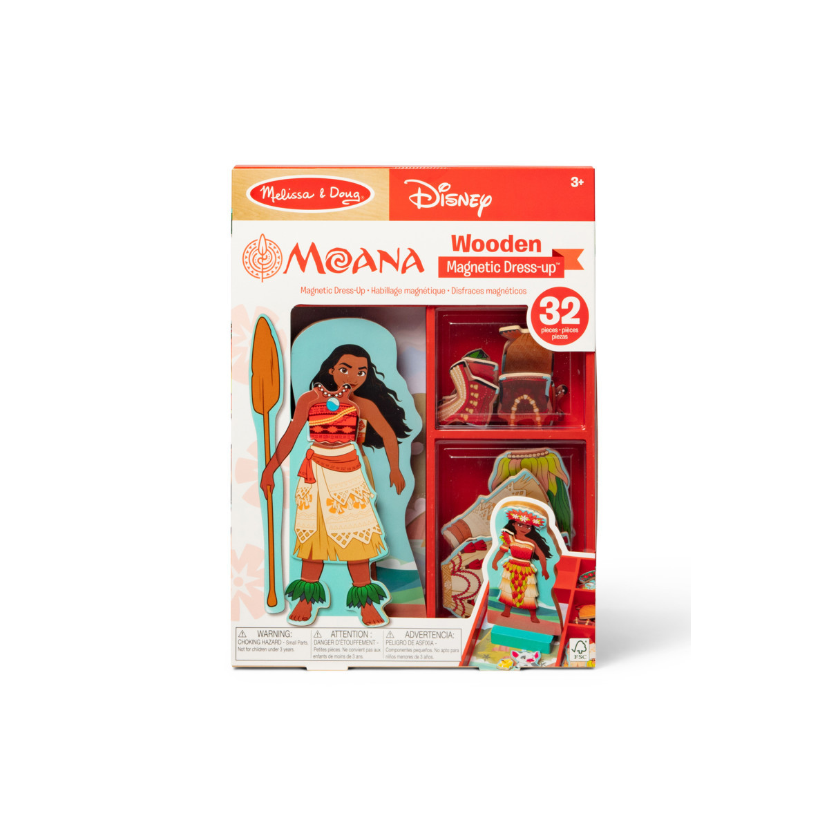 - Dress the Melissa & Doug wooden magnetic figure Disney Princess Moana in different magnetic outfits to mix and match again and again