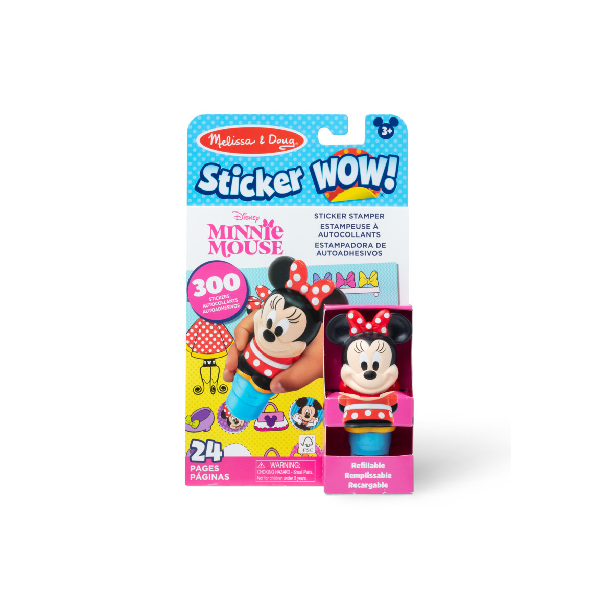 - Melissa & Doug Sticker WOW!™ is a whole new way to play with stickers – use the cute, collectible character to stamp Disney-themed stickers on the 24-page Disney Minnie Mouse activity pad and on other creative art projects