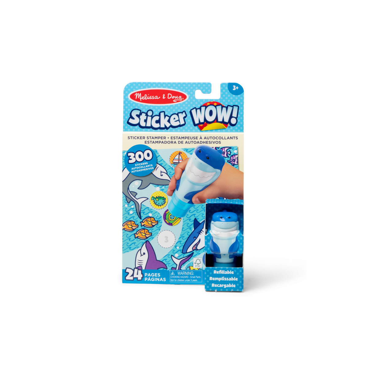Melissa & Doug Sticker WOW!™ is a whole new way to play with stickers! Let the adorable, collectible Stilton the Shark stamp, stamp, stamp its way through 24 pages of fun-filled, ocean-themed counting, matching, and search-and-find activities. The refillable sticker stamper comes pre-loaded with a sticker stack of 300 assorted stickers – with 100 unique designs in every stack, each sticker is a surprise! Themed refill packs are sold separately and are compatible with any Sticker WOW!™ sticker stamper. Stickers are not reusable, but are easy to remove if necessary. Fill in the activity pages and use for creative art projects, such as bookmarks, posters, cards, and more. Easy-to-remove stickers and the convenient on-the-go format with built-in sticker stamper storage makes Sticker WOW!™ (patent pending) a great mess-free travel activity. Sticker WOW!™ promotes fine motor skills, encourages creative play, and it’s satisfying, fidget fun!