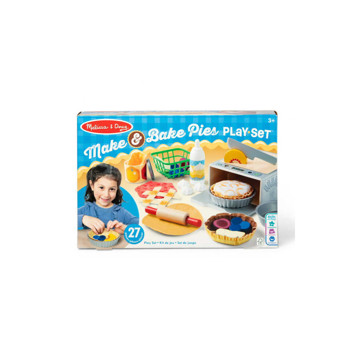 Feed hungry imaginations! The Melissa & Doug 27-piece pretend play pie-making set has everything kids need to prep, put together, and “bake” deliciously imaginative play pies. Roll a squishable, moldable fabric pie crust dough flat with the wooden rolling pin, then press it to form-fit into pie tins. Fill with double-sided puffy fabric filling for meringue or crumble-topped pie; with sliceable wooden fruit for blueberry, cherry, peach, or apple pies; or with double-side textured filling from a play can for pumpkin or cherry pies! Top with a lattice crust and pop a pie into the sturdy wooden play oven with built-in cutting board to “bake”! Top creations with shaped whipped cream dollops for scrumptious-looking play pies!