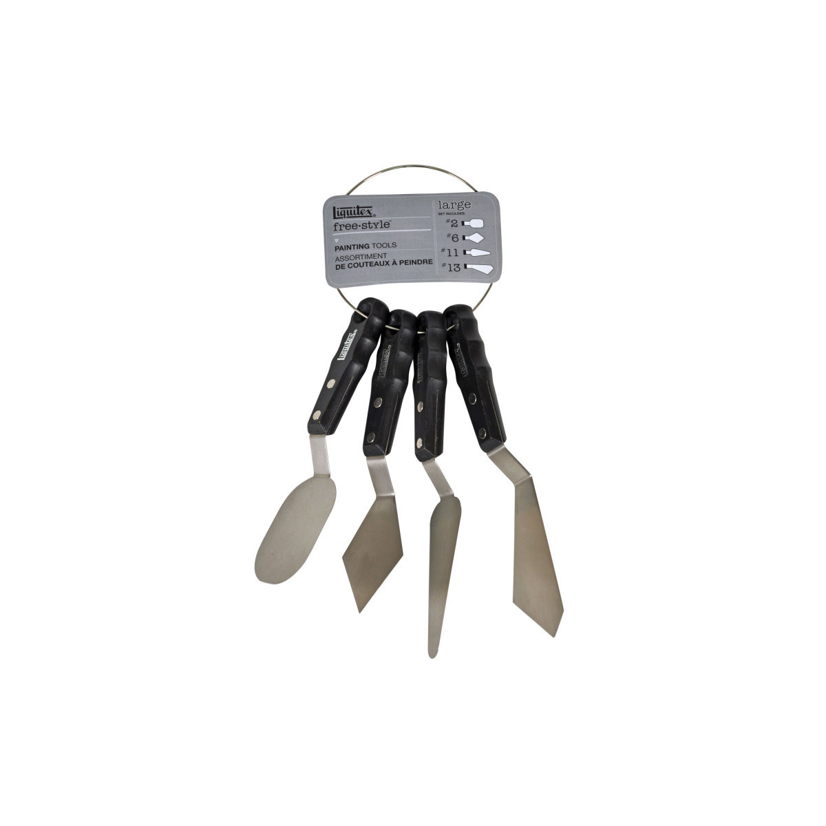 Tackle large-scale artwork with confidence using the Liquitex Professional Free-Style Large Scale Knives, 4-Piece Ring Set. Designed for artists working on murals, canvases, and mixed-media installations, this set includes four uniquely shaped, durable knives that deliver ultimate control for spreading, mixing, and sculpting acrylics, gels, and pastes. Each knife features a flexible stainless-steel blade with a strong, ergonomic handle designed for comfort and balance during extended use. Perfect for heavy-body acrylic applications and expressive mark-making, these knives make it easy to create rich textures and bold, sweeping effects on large surfaces. Liquitex Free-Style Knives are corrosion-resistant, easy to clean, and built to withstand the rigors of professional studio work.