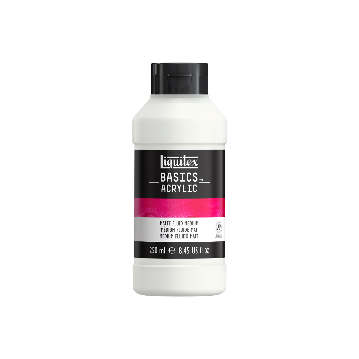Modify your acrylic paint with Liquitex BASICS Matte Fluid Medium, 250 mL Bottle—a versatile additive that extends color, improves flow, and reduces gloss for a smooth, matte finish. This fluid medium thins acrylic paints without sacrificing pigment strength, making it perfect for glazing, detail work, and blending techniques. It increases adhesion and flexibility while maintaining the integrity and vibrancy of your color. Use it alone as a transparent matte varnish or mix it directly with paint for subtle, non-reflective results. Ideal for artists, educators, and students, Liquitex BASICS Matte Fluid Medium is water-based, non-yellowing, and easy to clean up, providing reliable performance for fine art, craft, and classroom applications.