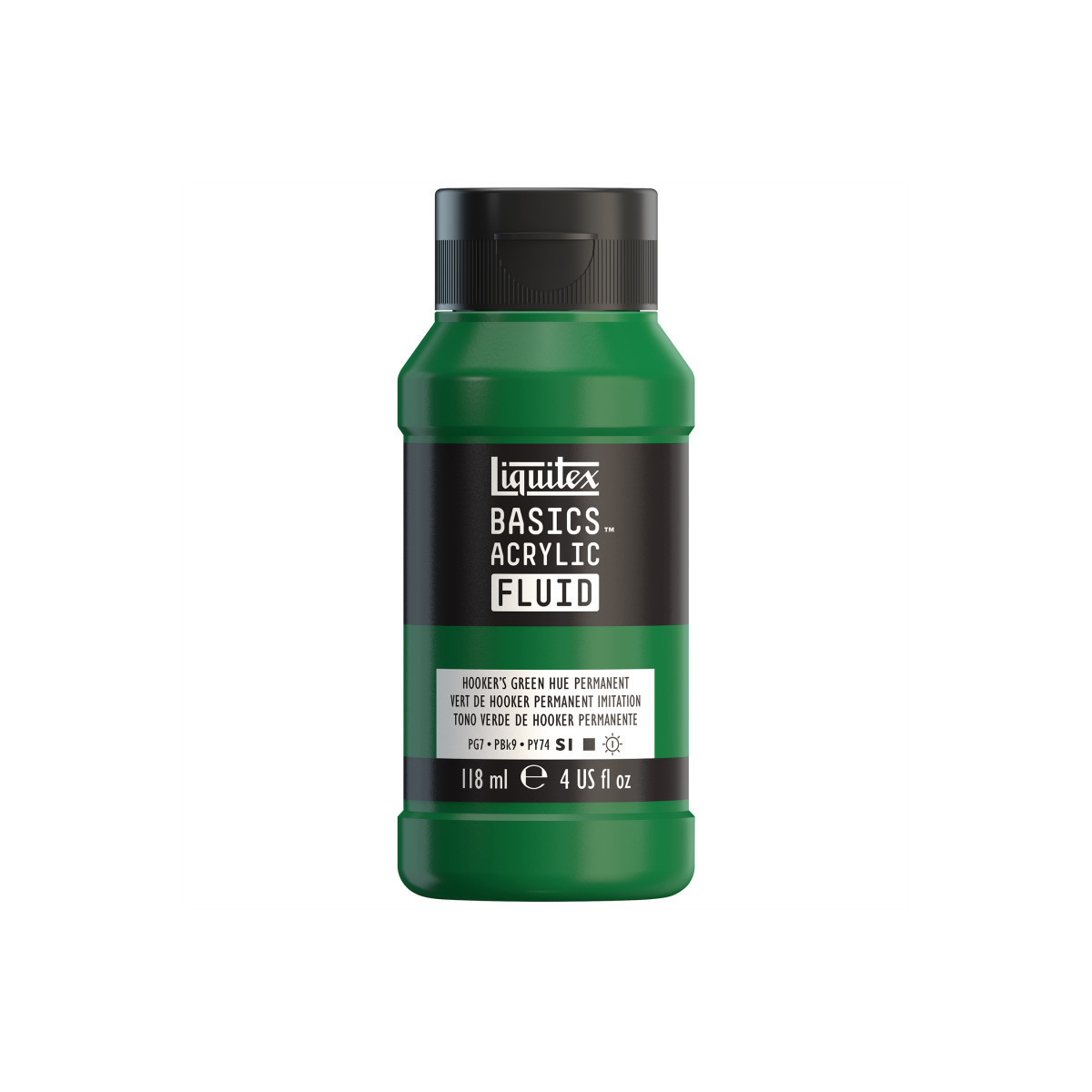 A rich dark green opaque color with a yellow tint. A mixed pigment hue, the original Hooker's green pigment was created by 19th century English botanist and illustrator William J Hooker. Enjoy smooth, pourable color with Liquitex BASICS Acrylic Fluid, 118 mL Bottle. Formulated with the same high-quality pigments as Liquitex BASICS Acrylics, this versatile fluid paint offers excellent coverage, color strength, and permanence in a low-viscosity format. It’s ideal for fine art, craft, and mixed-media techniques such as pouring, dripping, staining, and detail work. The ready-to-use consistency eliminates the need for dilution while maintaining brilliant, even color. Perfect for use on canvas, wood, paper, or fabric, it dries to a flexible, water-resistant finish with rich saturation and subtle sheen. Non-toxic and intermixable with all Liquitex acrylics and mediums, Liquitex BASICS Acrylic Fluid gives artists, educators, and students the freedom to explore expressive, high-flow applications with professional-quality results.