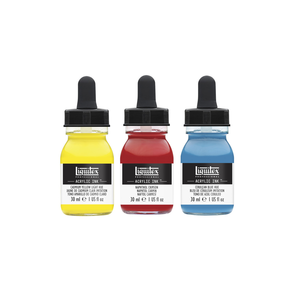 Discover Liquitex Acrylic Ink, our ultra-fluid professional acrylic. This set brings together three transparent and opaque core colors to add to your palette. Whether it’s letting delicate drops from a pipette swirl on a canvas, experimenting with dynamic airbrushing and pouring techniques, or enjoying classic pen & ink work, our most fluid acrylic helps you create in endless ways. Each ink is made with lightfast, artist quality pigments, so every color pops and stays true to its original character. Plus, the entire range is dye-free, smudge-free, water-resistant, permanent, lightfast, and comes in a variety of different opacities. Explore the depths of your creativity and imagination with Liquitex Acrylic Ink.