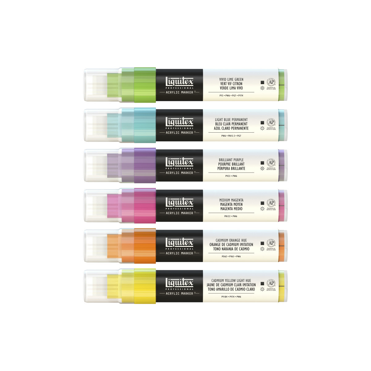 Made with highly lightfast artist-quality pigments, Acrylic Marker gives you the ultimate control, and is water-resistant when dry. This high-impact Vibrants set brings you a range of intense, vivid colors. Shake it up, pop the cap and feel inspiration flow. Enjoy the freedom to be able to create wherever, whenever, and however you want. Our pro range is all about giving you boundary-free ways to work and Acrylic Marker is a format with a difference. Each fine art marker-style pen is filled with professional acrylic paint that’s been made with only the finest, artist quality pigments. Fast-drying, lightfast and permanent, you don't need to worry about bleeding, smudging or fade-out. These vibrant marker pens will make your artwork stand out! Colors included: Cadmium Yellow Light Hue, Cadmium Orange Hue, Medium Magenta, Brilliant Purple, Light Blue Permanent, and Vivid Lime Green. The Liquitex acrylic paint markers in this set have a 15mm wide chisel tip.