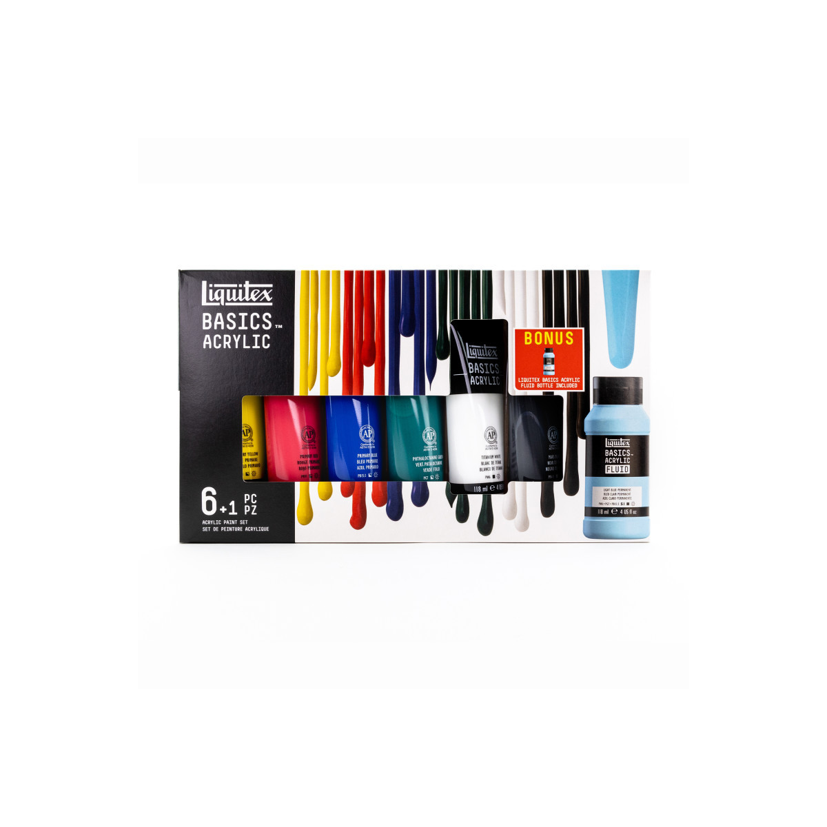Unleash your creativity with this set of 6 medium consistency acrylic colors, each formulated with artist-quality pigments. Bonus: includes 1 Liquitex Basics Acrylic Fluid bottle! Whether you’re a beginner on a budget, an experienced artist doing underpainting or sketching, or a creative professional doing color scoping and exploration, Liquitex Basics Acrylic has you covered. Formulated with the same lightfast, fine art pigments used in our professional range (just with a lighter pigment load), Basics Acrylic delivers a lightfast, medium viscosity experience that sacrifices nothing. It’s the perfect balance of quality, versatility, and economy. So, what are you waiting for? Jump straight in, go for it, and see what happens. Experience The Everyday Acrylic. Acrylic paint tube colors included: Mars Black, Phthalocyanine Green, Primary Blue, Primary Red, Primary Yellow, and Titanium White. Fluid acrylic paint color included: Light Blue Permanent.