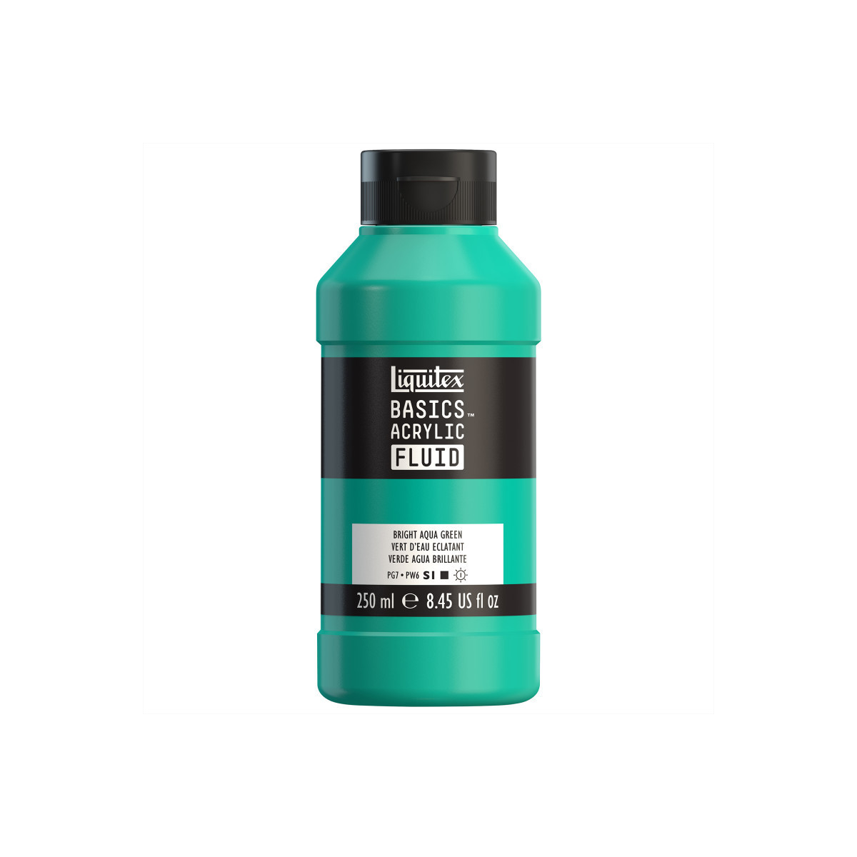 An opaque vivid green-blue color made with a mix of titanium white and phthalocyanine green (blue shade). Enjoy smooth, pourable color with Liquitex BASICS Acrylic Fluid, 250 mL Bottle. Formulated with the same high-quality pigments as Liquitex BASICS Acrylics, this versatile fluid paint offers excellent coverage, color strength, and permanence in a low-viscosity format. It’s ideal for fine art, craft, and mixed-media techniques such as pouring, dripping, staining, and detail work. The ready-to-use consistency eliminates the need for dilution while maintaining brilliant, even color. Perfect for use on canvas, wood, paper, or fabric, it dries to a flexible, water-resistant finish with rich saturation and subtle sheen. Non-toxic and intermixable with all Liquitex acrylics and mediums, Liquitex BASICS Acrylic Fluid gives artists, educators, and students the freedom to explore expressive, high-flow applications with professional-quality results.