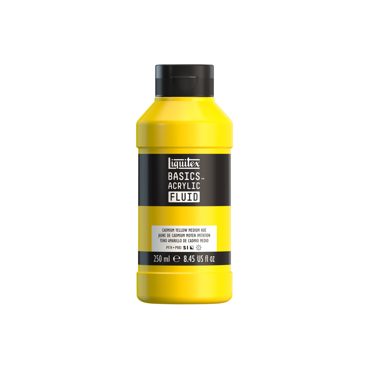 A mid-range yellow multi pigment hue color with semi-opacity. This hue is a recreation of the true inorganic cadmium pigment, which was discovered in 1817 as a by-product of the zinc industry. Enjoy smooth, pourable color with Liquitex BASICS Acrylic Fluid, 250 mL Bottle. Formulated with the same high-quality pigments as Liquitex BASICS Acrylics, this versatile fluid paint offers excellent coverage, color strength, and permanence in a low-viscosity format. It’s ideal for fine art, craft, and mixed-media techniques such as pouring, dripping, staining, and detail work. The ready-to-use consistency eliminates the need for dilution while maintaining brilliant, even color. Perfect for use on canvas, wood, paper, or fabric, it dries to a flexible, water-resistant finish with rich saturation and subtle sheen. Non-toxic and intermixable with all Liquitex acrylics and mediums, Liquitex BASICS Acrylic Fluid gives artists, educators, and students the freedom to explore expressive, high-flow applications with professional-quality results.