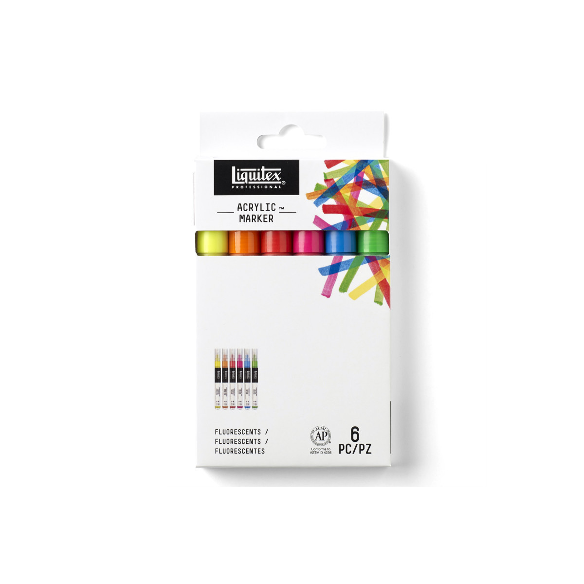 Made with artist-quality pigments, Acrylic Marker gives you the ultimate control. Add a new dimension to your palette with this fluorescent color collection, perfect for creating highlights and high-impact effects. Shake it up, pop the cap and feel inspiration flow. Enjoy the freedom to be able to create wherever, whenever, and however you want. Our pro range is all about giving you boundary-free ways to work and Acrylic Marker is a format with a difference. Each fine art marker-style pen is filled with professional acrylic paint that’s been made with only the finest, artist quality pigments. Fast-drying, lightfast and permanent, you don't need to worry about bleeding, smudging or fade-out. These vibrant marker pens will make your artwork stand out! Colors included: Fluorescent Yellow, Fluorescent Orange, Fluorescent Red, Fluorescent Blue, Fluorescent Green, and Fluorescent Pink. The Liquitex acrylic paint markers in this set have a 2 mm fine nib.