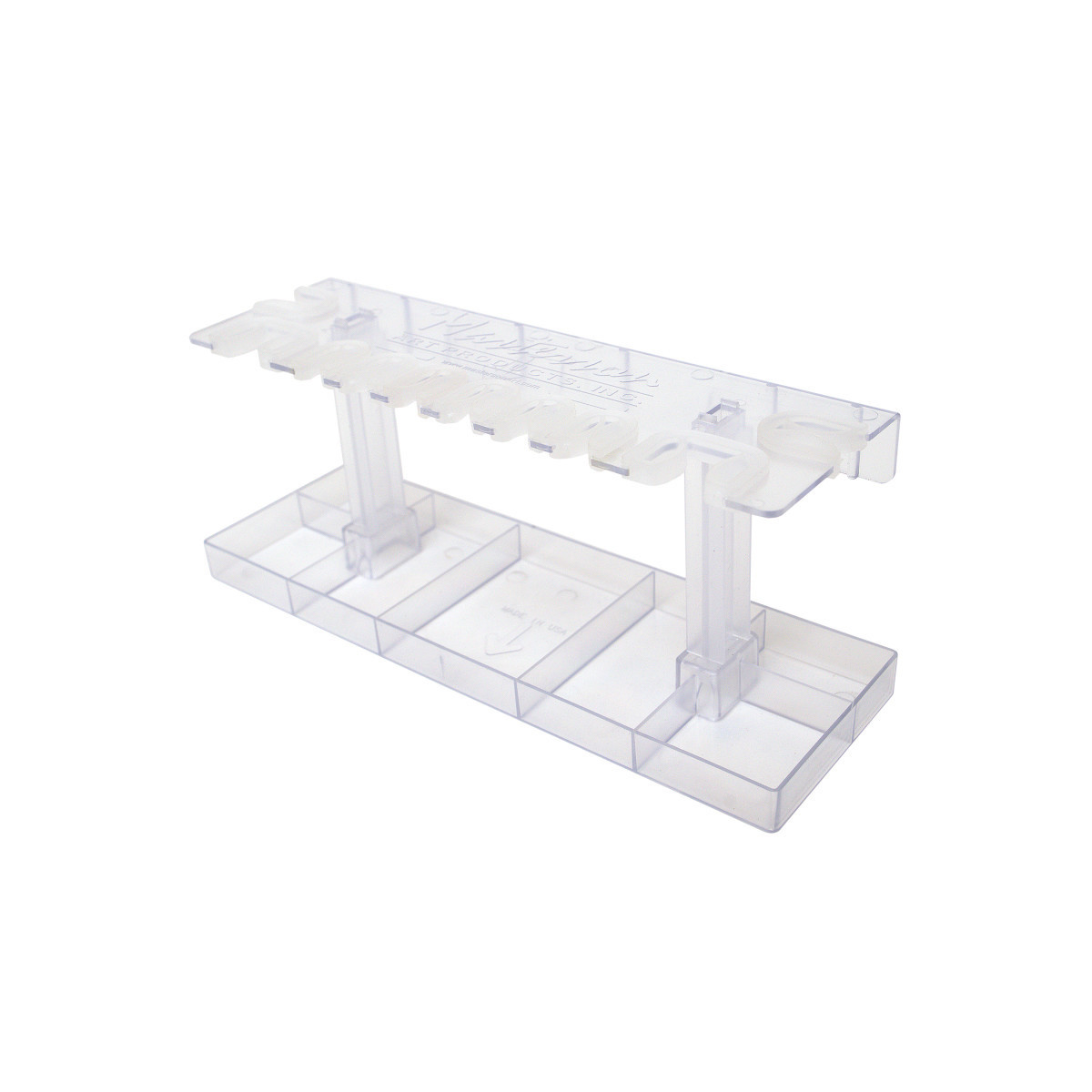 The Masterson Sta-New Brush Holder will organize, dry, and keep your brushes in like-new shape! The unique design holds your brushes with the bristles facing down, which will extend the life of your brushes. An array of brush handle thicknesses can be held firmly using 3 sizes of pliable rubber grasps. The bottom tray is meant to collect any drips that fall from your brush bristles when drying. Alternatively, the trays can be used to store supplies. In addition to helping keep your brushes separated and arranged neatly, The Sta-New Brush Holder can easily mount to an easel, studio table, wall, etc. with the supplied Velcro tabs. For stronger mounting, you have the option of anchoring the brush holder through the inlets on the top of the brush holder with anchors and screws (anchors and screws not included).