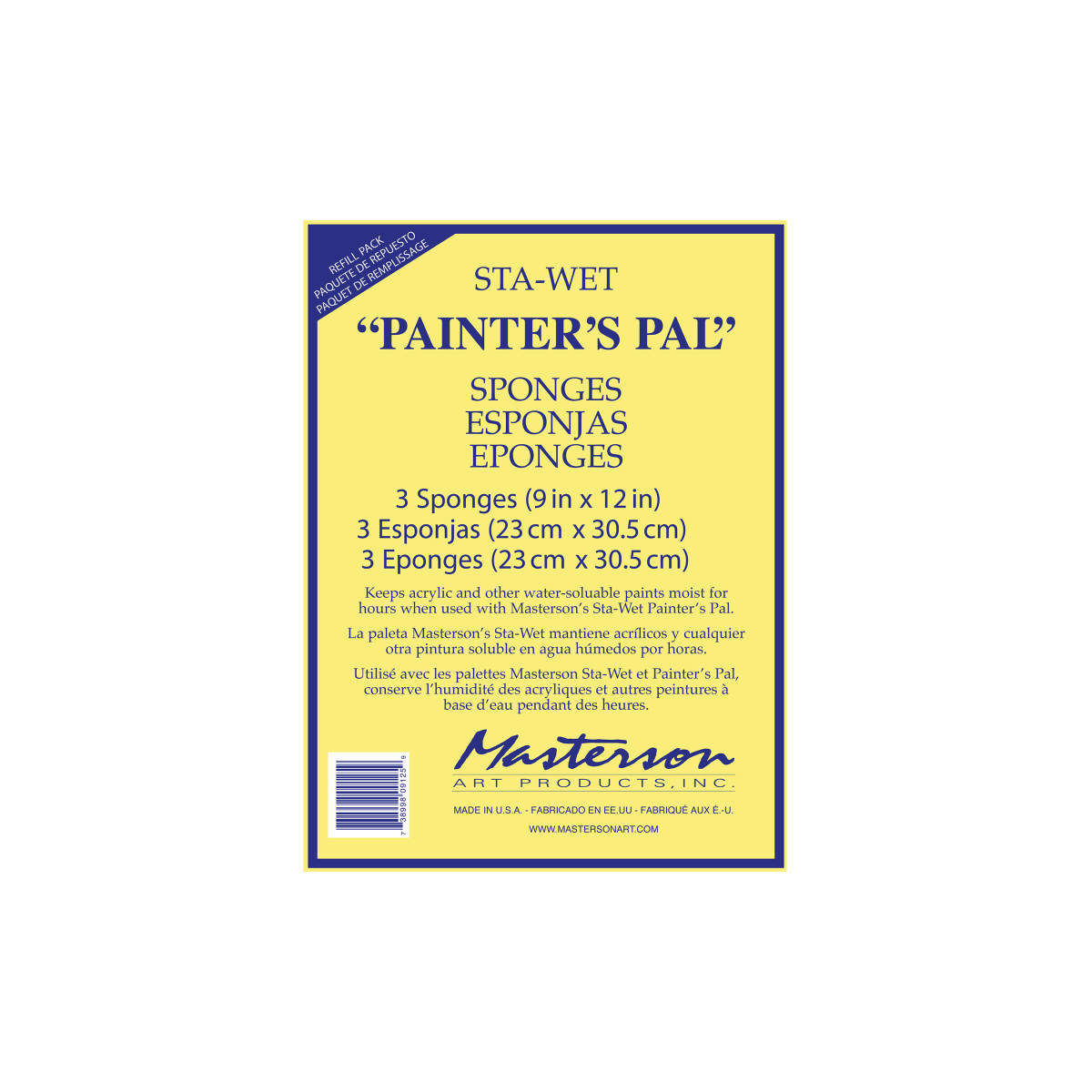 Keep your Sta-Wet® system performing at its best with the Sta-Wet® Painter’s Pal Sponge Refill Pack, 9 x 12 in, 3-Pack. Designed specifically for the Masterson Sta-Wet® Painter’s Pal, these premium absorbent sponges ensure proper humidity control by transferring moisture evenly to the Sta-Wet® palette paper above. This helps maintain the ideal environment to keep acrylics and other water-based paints fresh, smooth, and ready to use for days—even between painting sessions. Each sponge fits perfectly inside the Painter’s Pal tray, offering consistent coverage across the entire mixing surface. Durable, reusable, and easy to clean, these sponges resist mold, odor, and breakdown with proper care. Ideal for studios, classrooms, and travel setups, this refill pack helps artists preserve paint quality, reduce waste, and extend palette use time.