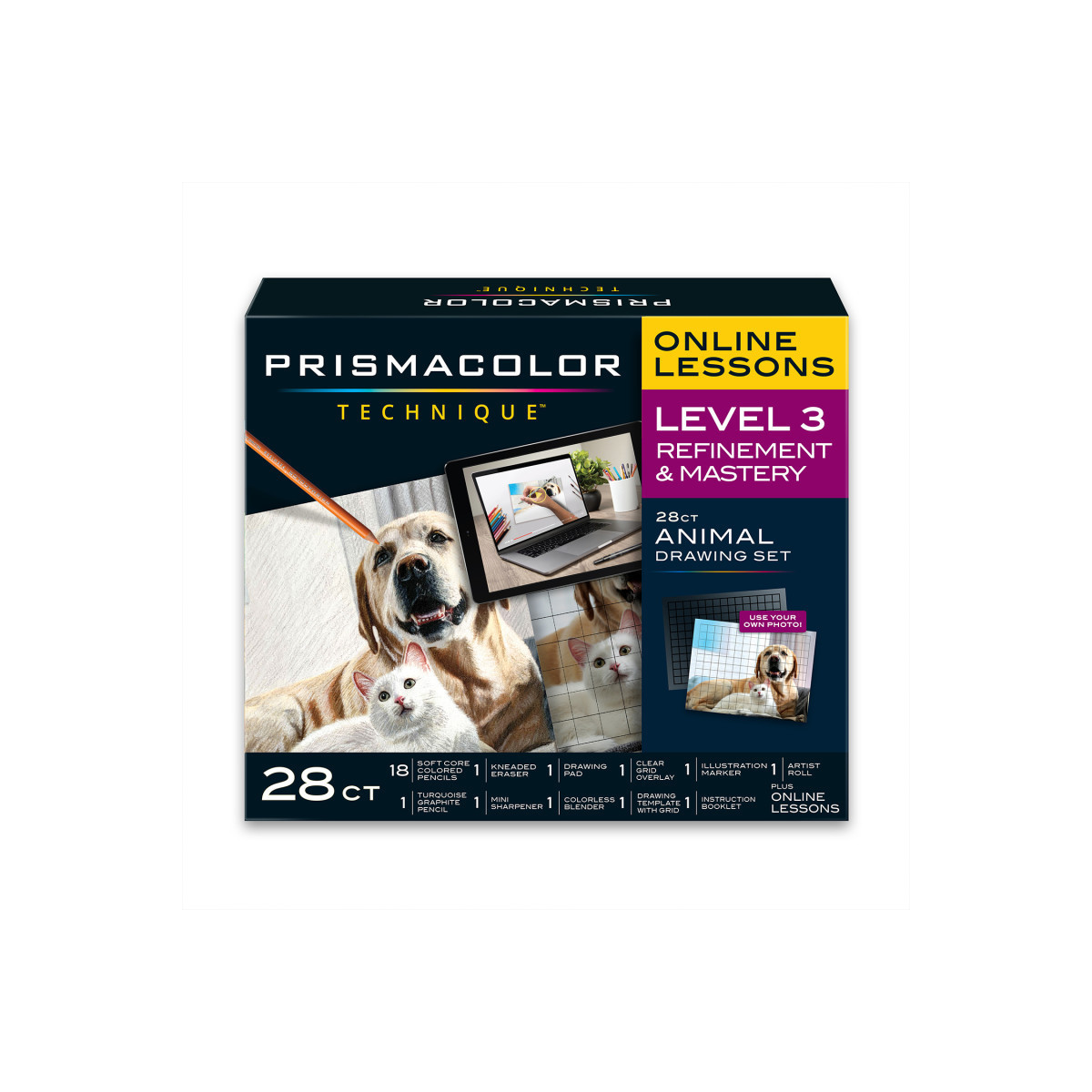 Learn art at your own pace from the comfort of home with Prismacolor Technique. Each Prismacolor Technique set features a unique coupon code for access to digital art lessons you can't get anywhere else. Instructed by Prismacolor artists, each lesson will teach you how to use the professional-grade art supplies included in the set to create a piece of art you will cherish. The Level 3 Animal Drawing Set is designed for those who have built up some skill and confidence in art. You'll learn how to take your skills to the next level by recreating any animal photo using reference grids. The set features Prismacolor colored pencils with rich cores for smooth color laydown and an artist roll case so you can store and carry your art tools. You'll also receive an illustration marker, a clear reference grid overlay, a graphite pencil, a colorless blender, an eraser, a drawing pad, a mini sharpener, a drawing template with grid, a set of instructions, and hours of online content to learn at your convenience!