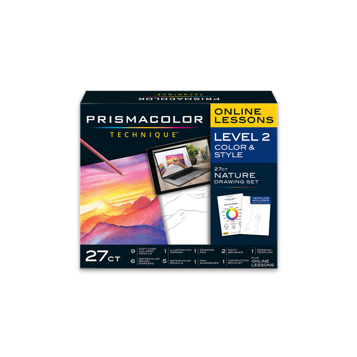 Learn art at your own pace from the comfort of home with Prismacolor Technique. Each Prismacolor Technique set features a unique coupon code for access to digital art lessons you can't get anywhere else. Instructed by Prismacolor artists, each lesson will teach you how to use the professional-grade art supplies included in the set to create a piece of art you will cherish. The Level 2 Nature Drawing Set is designed for those who want to keep building on their art knowledge. You'll practice color usage and style while creating a stunning sunset landscape. The set features Prismacolor colored pencils with rich cores for smooth color laydown, and watercolor pencils and brush markers that create brilliant watercolor effects. You'll also receive brushes, an eraser, a drawing pad, a mini sharpener, a drawing template, a set of instructions, and hours of online content to learn at your convenience!