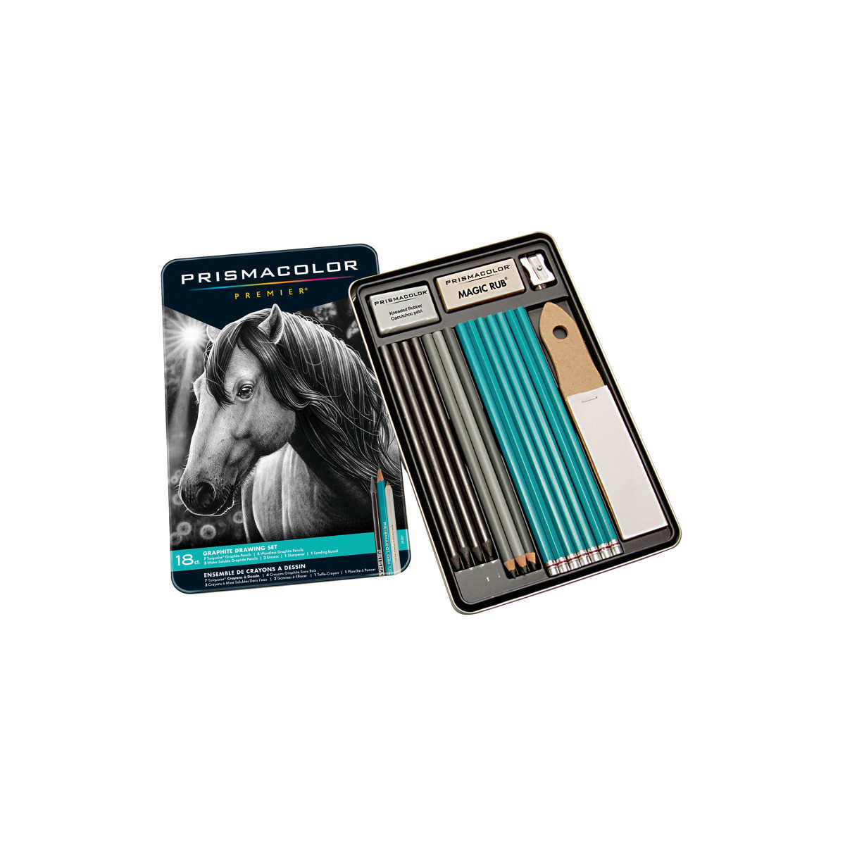 - Includes: 7 Turquoise drawing pencils (8B, 6B, 2B, B, 2H, 4H & 6H), 4 woodless graphite pencils (2B, 4B, 6B & 8B), 3 water-soluble graphite pencils (HB, 4B & 8B), 2 erasers (Magic Rub vinyl & kneaded rubber), 1 steel sharpener and 1 sanding board