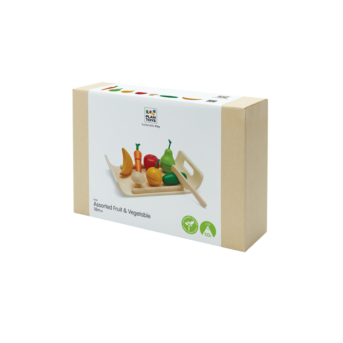 - Includes apple, pear, orange, banana, cucumber, mushroom, carrot, wooden knife, and tray