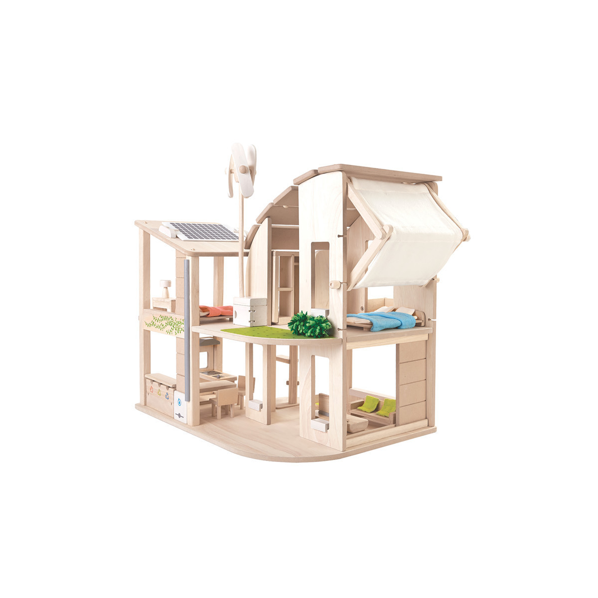 - GREEN WOODEN DOLLHOUSE includes dollhouse furniture set and energy-efficient design including wind turbine, solar cell, and recycling bins to promote child education about sustainable living