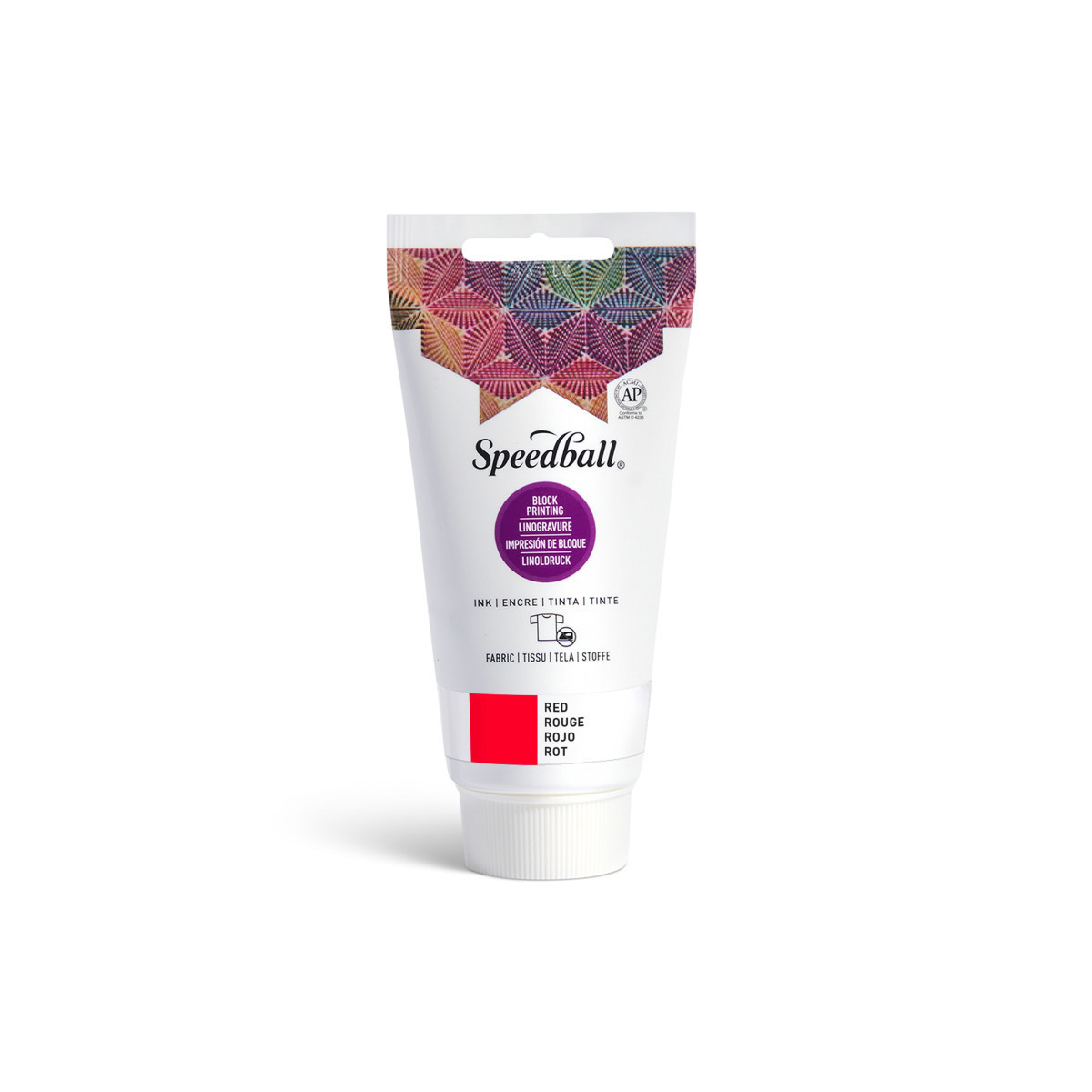 Bring brilliant, lasting color to your textile designs with Speedball® Fabric Block Printing Ink, 2.5 oz, Red. This innovative ink offers the professional quality of traditional fabric printing inks with the convenience of a no-heat formula—no ironing or curing required. The rich red pigment provides bold, opaque coverage on both light and dark fabrics while maintaining a soft hand and excellent flexibility once dry. Its creamy consistency ensures smooth roll-out and consistent inking for sharp, detailed prints on linoleum, wood, or soft-cut blocks. The water-soluble formula cleans easily with soap and water and dries to a permanent, colorfast finish that resists fading and cracking. Non-toxic and AP certified, Speedball Fabric Block Printing Ink delivers professional-grade results for artists, crafters, and educators working on fabric or mixed media surfaces.