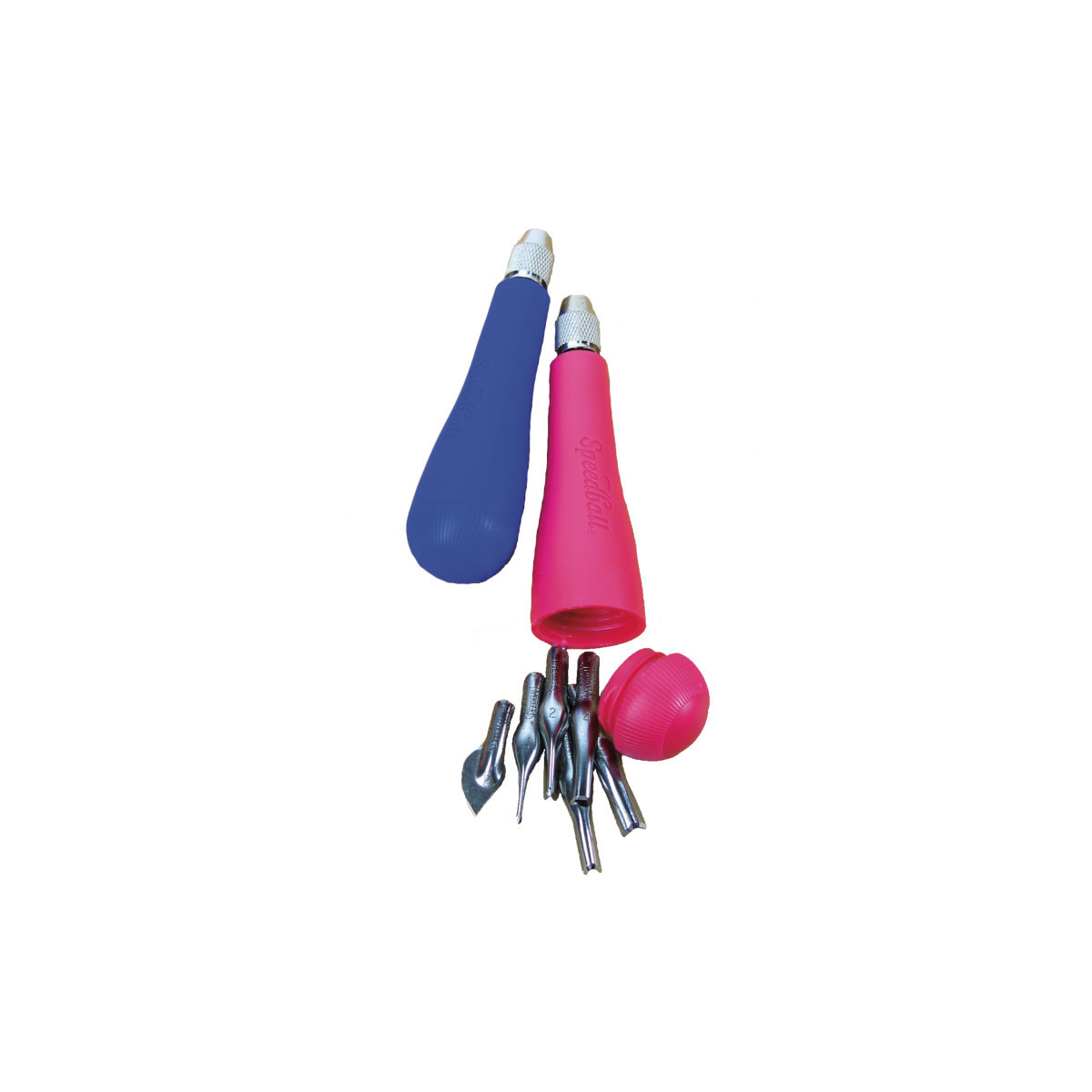Designed for versatility and comfort, the Speedball® Lino Cutter Assortment, No. 2 provides everything needed to begin or expand your block printing practice. Crafted from high-quality steel, each cutter is machine-ground to a sharp, durable edge, ideal for carving into both traditional linoleum and soft-cut blocks. The set includes two hard plastic lino handles (one red and one blue), each with a removable end cap that conveniently stores cutters inside the handle when not in use. Six interchangeable cutters, #1, #2, #3, #4, #5, and #6, offer a range of line widths and cutting styles for detailed designs or broad texture work.