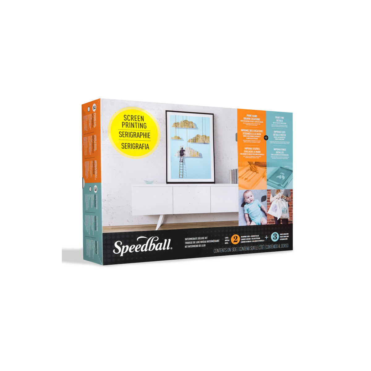 The Speedball® Intermediate Deluxe Screen Printing Kit provides everything needed to explore both major screen printing techniques, drawing fluid/screen filler and photo emulsion, while printing on paper, fabric, apparel, posters, and more. This all-in-one kit includes two wooden screen frames (10x14 in and 8x10 in), both crafted with high-quality mesh suitable for graphic and textile printing. It also features two craft squeegees, a complete set of Speedball inks for both fabric and paper, and all the necessary chemicals for emulsion-based printing, including diazo photo emulsion, sensitizer, screen filler, drawing fluid, emulsion remover, and Speed Clean. Additional tools such as transparencies, craft sticks, a brush, and a sheet of black paper support stencil creation and exposure.