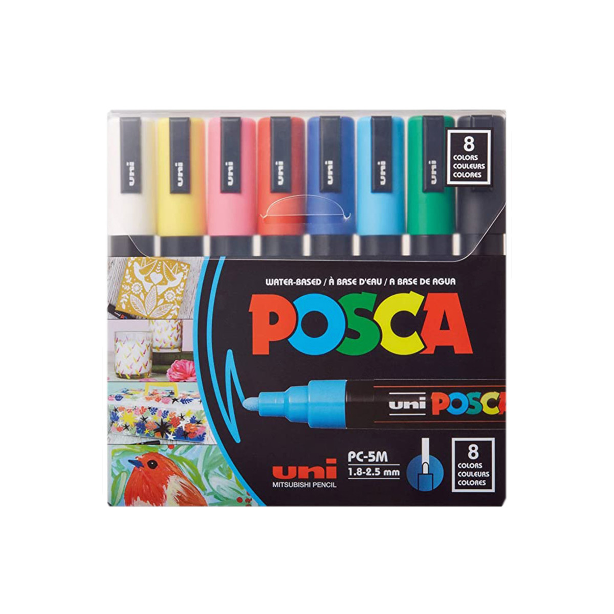 Create bold, vibrant artwork with the POSCA PC-5M Paint Markers, Reversible Medium Bullet Tip (1.8–2.5 mm), Assorted Colors, Set of 8. These versatile paint markers are designed for smooth, even coverage on a wide range of surfaces, including paper, canvas, wood, metal, plastic, glass, ceramic, fabric, and stone. The medium bullet tip offers excellent control and flexibility, fine enough for outlining and lettering, yet broad enough for coloring, shading, and larger areas. The highly opaque, water-based paint applies cleanly, dries quickly to a matte finish, and resists smudging, bleeding, and fading. POSCA’s reversible tip can be removed, flipped, or replaced to extend the life of each marker. Ideal for illustration, mixed media, journaling, craft projects, customization, and classroom use, the PC-5M marker is one of POSCA’s most popular sizes for artists and students who need reliable, multi-surface performance. Colors Included: White, Yellow, Pink, Red, Blue, Light Blue, Green, Black.