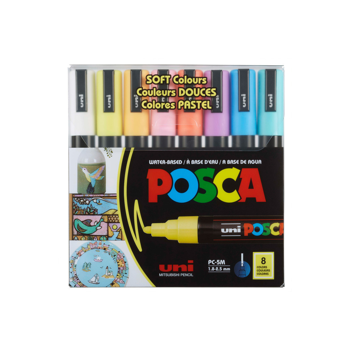 Create gentle, subtle artwork with the POSCA PC-5M Paint Markers, Soft Colors, Set of 8. These markers offer smooth, consistent lines with a reversible medium bullet tip and highly opaque matte paint. Perfect for journaling, lettering, crafting, illustration, and mixed media, this pastel-themed set layers beautifully and delivers delicate color that dries quickly without smudging. Suitable for beginners, students, and professional artists. Colors Included: White, Sunshine Yellow, Apricot, Light Pink, Coral Pink, Lavender, Light Blue, Aqua Green.