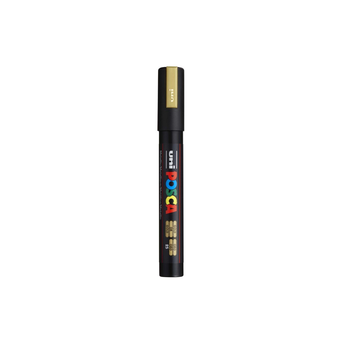 Create bold, vibrant artwork with the POSCA PC-5M Paint Marker, Reversible Medium Bullet Tip (1.8–2.5 mm), Gold. This versatile paint marker is designed for smooth, even coverage on a wide range of surfaces, including paper, canvas, wood, metal, plastic, glass, ceramic, fabric, and stone. The medium bullet tip offers excellent control and flexibility, fine enough for outlining and lettering, yet broad enough for coloring, shading, and larger areas. The highly opaque, water-based paint applies cleanly, dries quickly to a metallic gold finish, and resists smudging, bleeding, and fading. POSCA’s reversible tip can be removed, flipped, or replaced to extend the life of each marker.