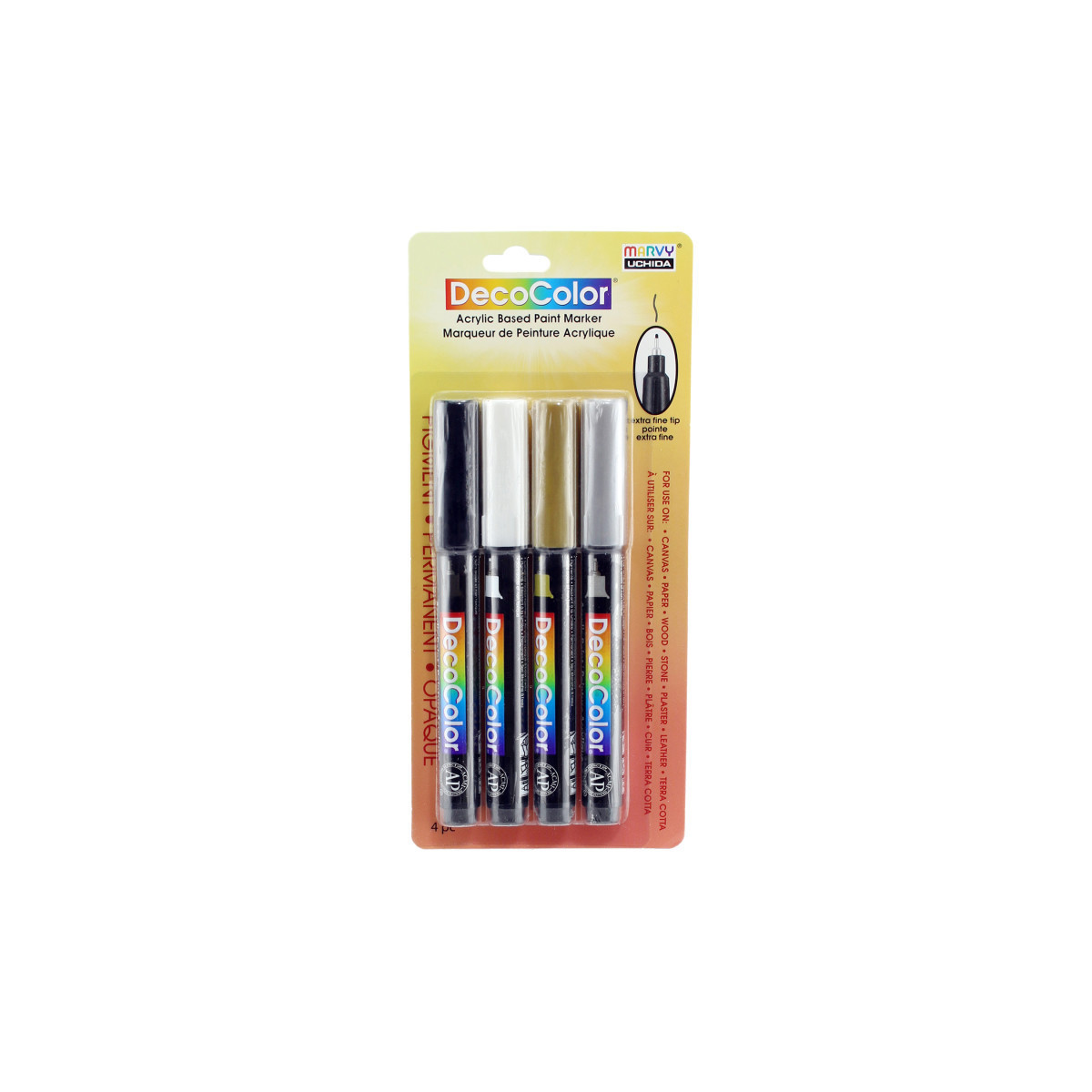 Add crisp, highly opaque details to your artwork with the DecoColor® Acrylic Paint Markers by Marvy Uchida®, Extra Fine Tip, Set of 4. This curated collection includes gold, silver, white, and black, essential colors for outlining, lettering, embellishing, and adding metallic or high-contrast accents. Each marker features an extra fine tip designed for precise, controlled application on paper, canvas, wood, plastic, metal, glass, ceramics, and other surfaces. The water-based acrylic paint flows smoothly, dries quickly to a durable, matte finish, and resists smudging and fading. Ideal for illustration, journaling, cardmaking, craft projects, and mixed-media artwork, these markers layer cleanly without bleed-through. Whether used in the classroom, studio, or at home, DecoColor® Acrylic Paint Markers provide professional-quality performance for artists and creative students who need fine, reliable lines in vibrant, opaque color.