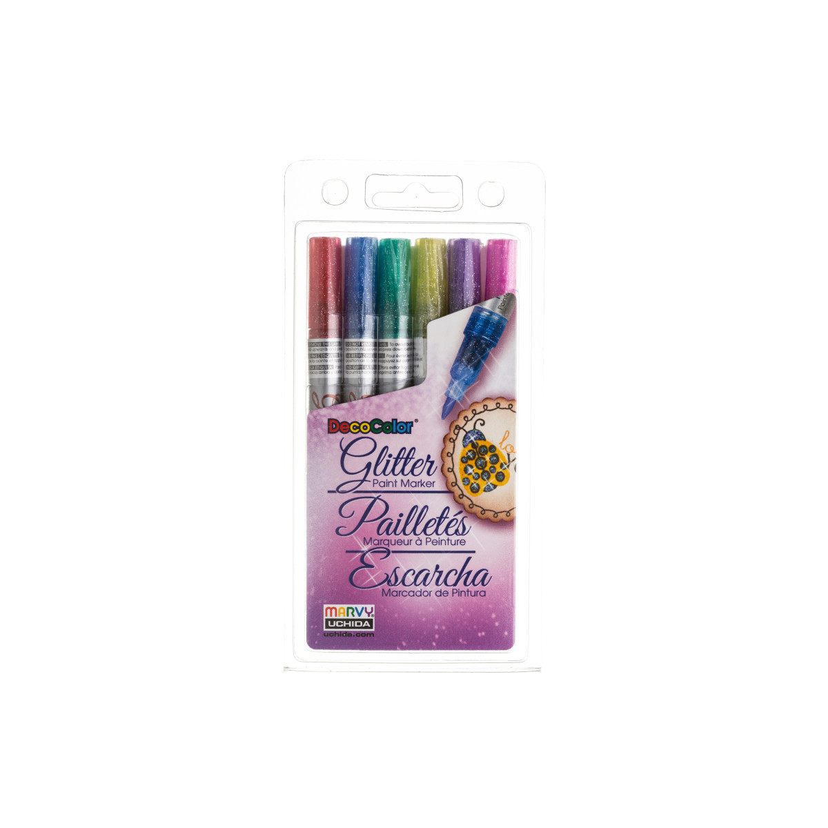 Add sparkling, eye-catching effects to your artwork with the DecoColor® Paint Markers by Marvy Uchida®, Glitter Colors, Set of 6. These vibrant markers feature a fine plastic point that delivers smooth, precise lines infused with ultra-fine glitter for a brilliant, shimmering finish. The alcohol-based, pigmented ink provides consistent color, dries quickly, and remains lightfast to prevent fading over time. Each marker is acid-free, non-toxic, and conforms to ASTM D4236, making them safe for classroom, home, and studio use. Designed to work beautifully on metal, wood, stone, paper, and other porous or semi-porous surfaces, these glitter markers are perfect for lettering, embellishing cards, scrapbooking, journaling, decorative artwork, and craft projects. Whether adding highlights or creating bold sparkling accents, DecoColor® Glitter Paint Markers offer reliable performance and dazzling results for artists of all skill levels. Colors included: Red, Green, Yellow, Blue, Violet, Magenta.