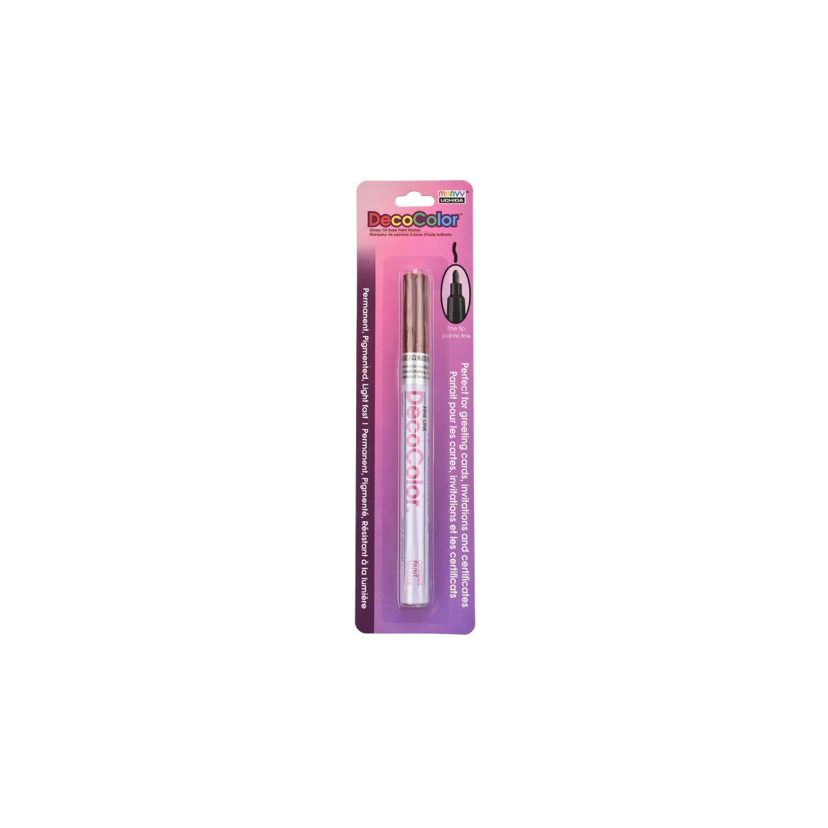 Create clean, permanent lines on a wide variety of surfaces with the DecoColor® Paint Marker, Fine Tip, 200-S, Brown by Marvy Uchida®. This versatile marker features a fine point that delivers smooth, controlled application ideal for labeling, outlining, detailing, and decorative artwork. The oil-based, pigmented ink provides strong opacity, dries permanently, and remains lightfast for long-lasting color. It is acid free, weatherproof, and designed to cover most non-coated surfaces including glass, clay, wood, stone, porcelain, mirrors, metal, and paper. The durable formula includes xylene for enhanced adhesion and performance, making it suitable for indoor and outdoor projects where permanence is essential.