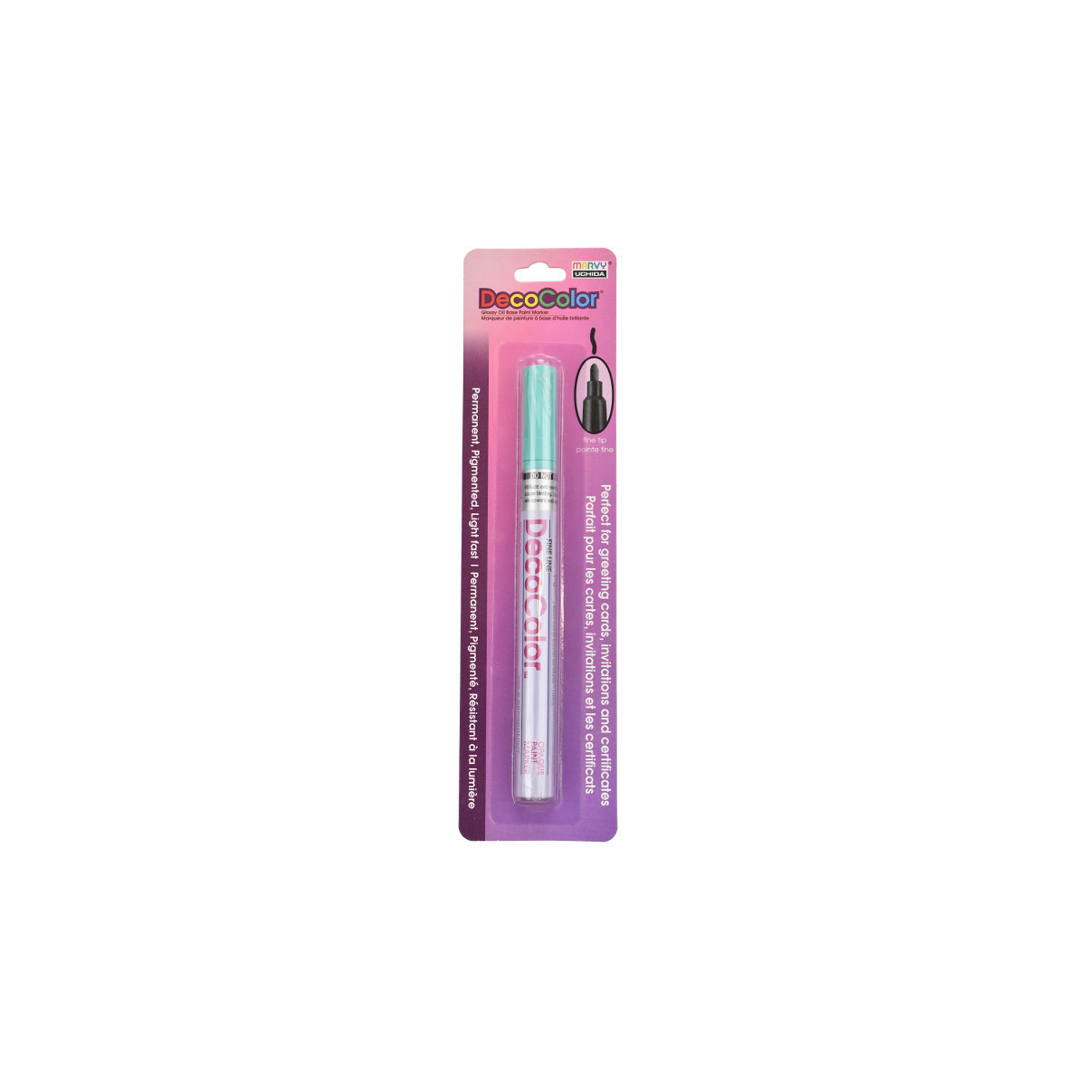 Create clean, permanent lines on a wide variety of surfaces with the DecoColor® Paint Marker, Fine Tip, 200-S, Peppermint by Marvy Uchida®. This versatile marker features a fine point that delivers smooth, controlled application ideal for labeling, outlining, detailing, and decorative artwork. The oil-based, pigmented ink provides strong opacity, dries permanently, and remains lightfast for long-lasting color. It is acid free, weatherproof, and designed to cover most non-coated surfaces including glass, clay, wood, stone, porcelain, mirrors, metal, and paper. The durable formula includes xylene for enhanced adhesion and performance, making it suitable for indoor and outdoor projects where permanence is essential. Users should test the marker on an inconspicuous area first, as results may vary depending on surface type, finish, climate, and material composition. DecoColor® Fine Tip Paint Markers are ideal for artists, hobbyists, and makers who need crisp, reliable, permanent marks across multiple hard surfaces.