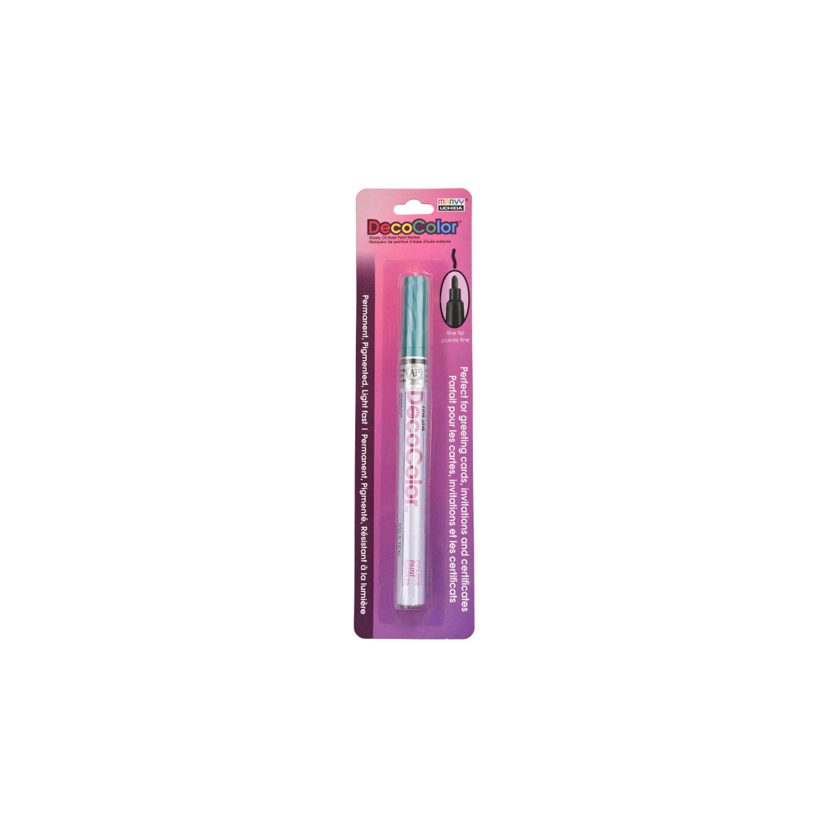 Create clean, permanent lines on a wide variety of surfaces with the DecoColor® Paint Marker, Fine Tip, 200-S, Teal by Marvy Uchida®. This versatile marker features a fine point that delivers smooth, controlled application ideal for labeling, outlining, detailing, and decorative artwork. The oil-based, pigmented ink provides strong opacity, dries permanently, and remains lightfast for long-lasting color. It is acid free, weatherproof, and designed to cover most non-coated surfaces including glass, clay, wood, stone, porcelain, mirrors, metal, and paper. The durable formula includes xylene for enhanced adhesion and performance, making it suitable for indoor and outdoor projects where permanence is essential. Users should test the marker on an inconspicuous area first, as results may vary depending on surface type, finish, climate, and material composition. DecoColor® Fine Tip Paint Markers are ideal for artists, hobbyists, and makers who need crisp, reliable, permanent marks across multiple hard surfaces.