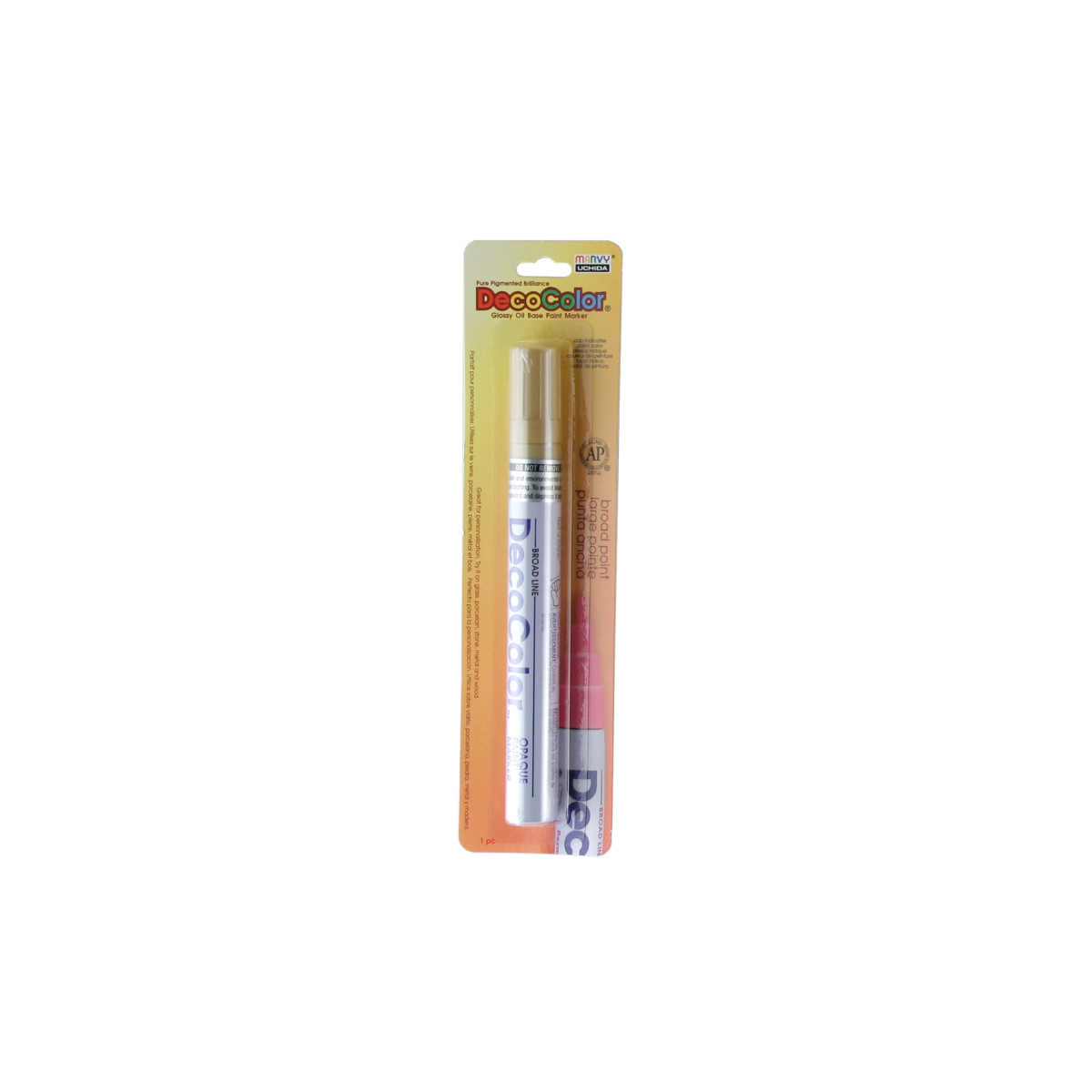 Create strong, opaque marks on a wide variety of surfaces with the DecoColor® Paint Marker, Broad Tip, 300-S, Gold by Marvy Uchida®. Featuring a broad point designed for thick lines, bold lettering, signage, and high-visibility artwork, this marker delivers smooth, consistent coverage with pigmented oil-based ink. The permanent, lightfast formula is acid free, weatherproof, and designed for long-lasting performance indoors or outdoors. It adheres cleanly to most non-coated surfaces including glass, clay, wood, stone, porcelain, mirrors, metal, and paper. The ink flows evenly for reliable application and dries to a durable finish that resists fading and smudging. Conforming to ASTM D4236, this marker is suitable for use in classrooms, studios, workshops, and craft environments.