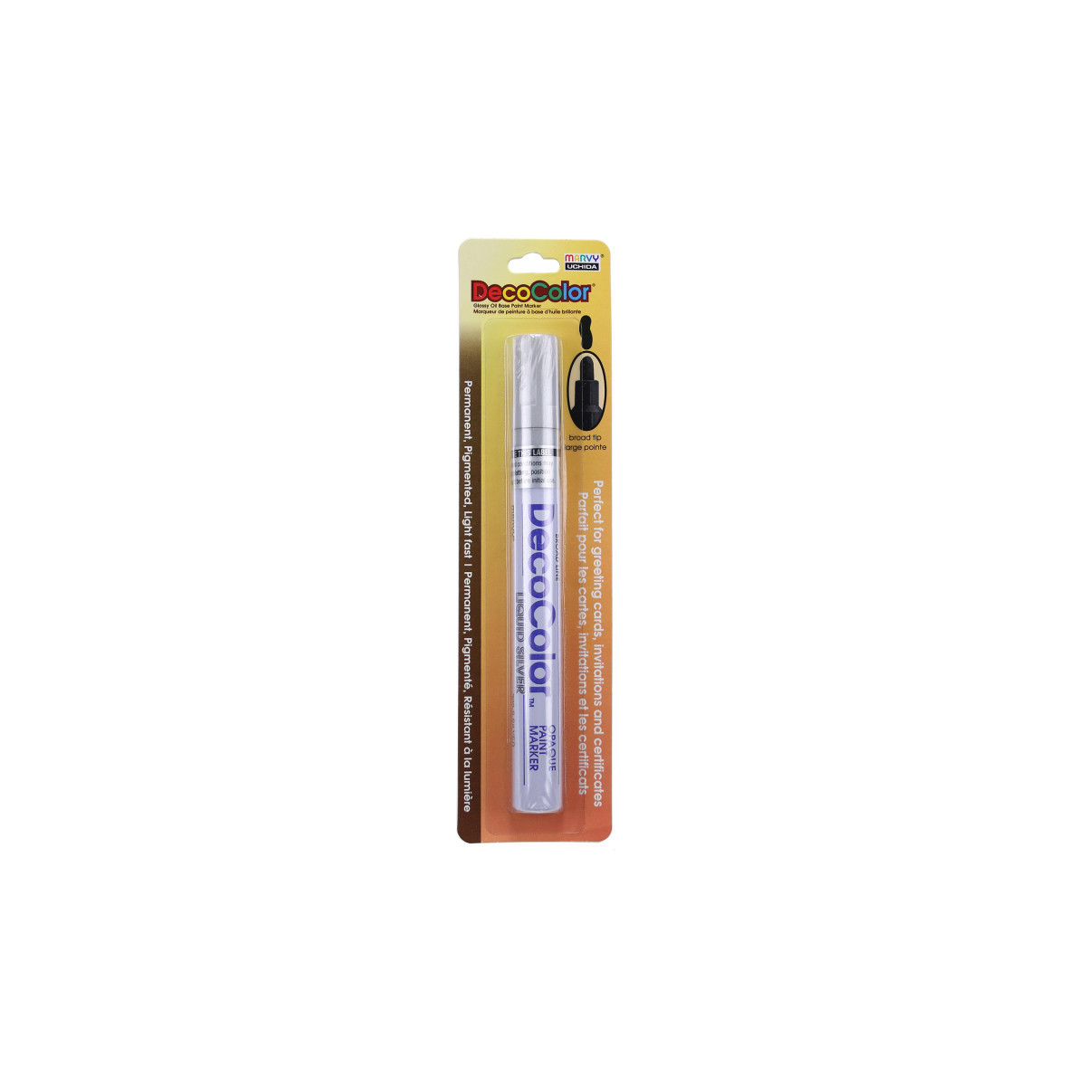 Create strong, opaque marks on a wide variety of surfaces with the DecoColor® Paint Marker, Broad Tip, 300-S, Silver by Marvy Uchida®. Featuring a broad point designed for thick lines, bold lettering, signage, and high-visibility artwork, this marker delivers smooth, consistent coverage with pigmented oil-based ink. The permanent, lightfast formula is acid free, weatherproof, and designed for long-lasting performance indoors or outdoors. It adheres cleanly to most non-coated surfaces including glass, clay, wood, stone, porcelain, mirrors, metal, and paper. The ink flows evenly for reliable application and dries to a durable finish that resists fading and smudging. Conforming to ASTM D4236, this marker is suitable for use in classrooms, studios, workshops, and craft environments. Ideal for posters, decorative projects, labeling, and bold accent work, DecoColor® Broad Tip Paint Markers offer dependable, highly visible color with strong adhesion.