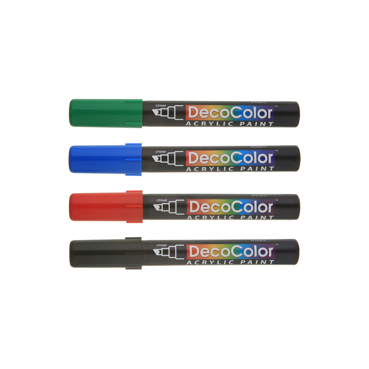 Create bold, versatile strokes with the DecoColor® Acrylic Paint Markers, Chisel Tip, Primary Colors Set of 4 by Marvy Uchida®. Designed for smooth application on a wide range of craft and art surfaces, this marker features a 3-way chisel tip that allows artists to produce broad strokes, thin lines, and precise angled marks with a single tool. The opaque, pigmented acrylic paint is acid free, non-toxic, and permanent when dry, making it ideal for both indoor and outdoor projects. It works beautifully on wood, plaster, foam, walls, paper, terra cotta, and other porous or semi-porous surfaces. These markers are an excellent choice for school projects, decorative outdoor crafts like painted flower pots and benches, signage, and general arts-and-crafts creativity. Easy to control and reliable in coverage, the DecoColor® Acrylic Chisel Tip Marker offers strong color payoff and durable performance for students, hobbyists, and creative makers. Colors included: black, red, blue, green.