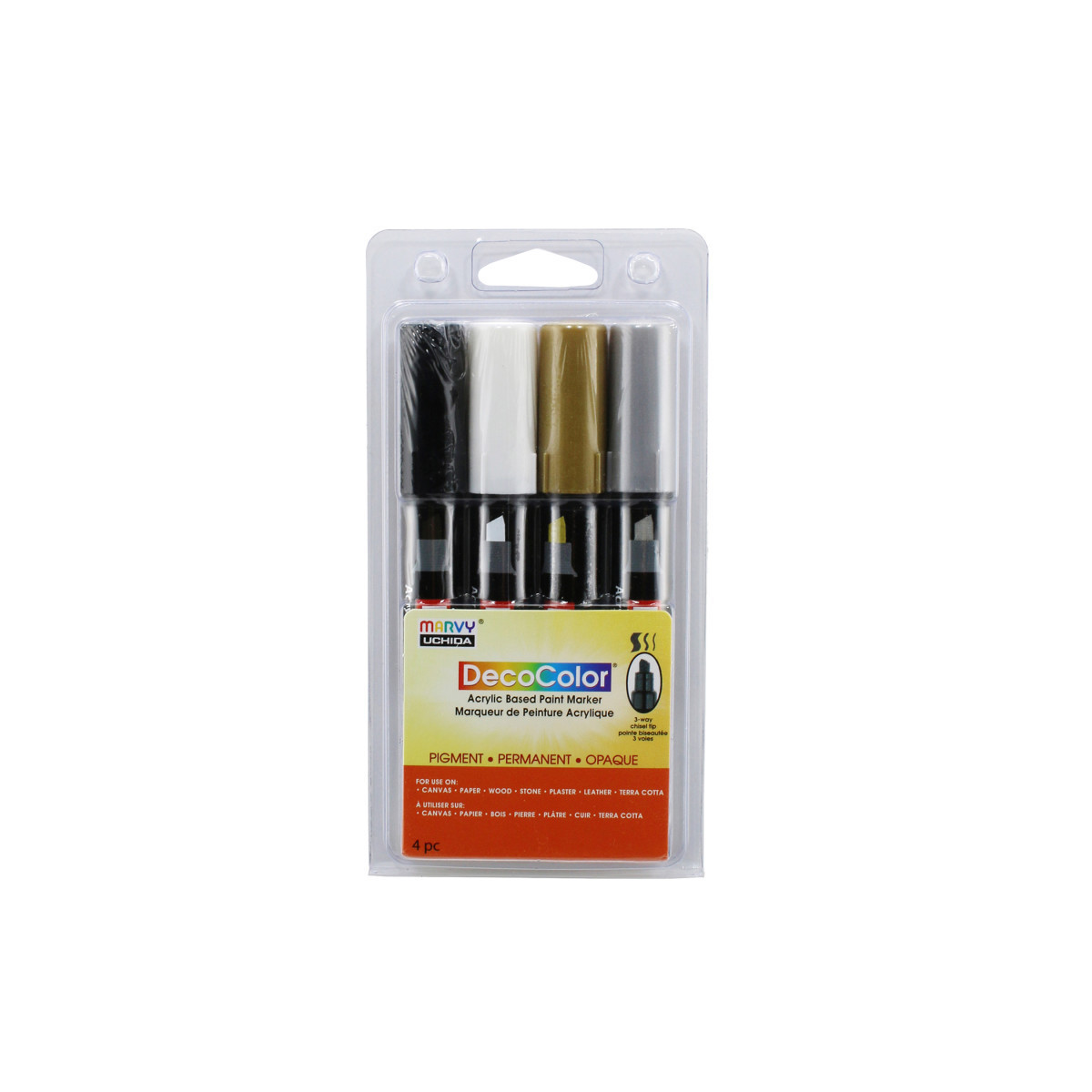 Create bold, versatile strokes with the DecoColor® Acrylic Paint Markers, Chisel Tip, Classic Colors Set of 4 by Marvy Uchida®. Designed for smooth application on a wide range of craft and art surfaces, this marker features a 3-way chisel tip that allows artists to produce broad strokes, thin lines, and precise angled marks with a single tool. The opaque, pigmented acrylic paint is acid free, non-toxic, and permanent when dry, making it ideal for both indoor and outdoor projects. It works beautifully on wood, plaster, foam, walls, paper, terra cotta, and other porous or semi-porous surfaces. These markers are an excellent choice for school projects, decorative outdoor crafts like painted flower pots and benches, signage, and general arts-and-crafts creativity. Easy to control and reliable in coverage, the DecoColor® Acrylic Chisel Tip Marker offers strong color payoff and durable performance for students, hobbyists, and creative makers. Colors included: black, white, gold, silver.