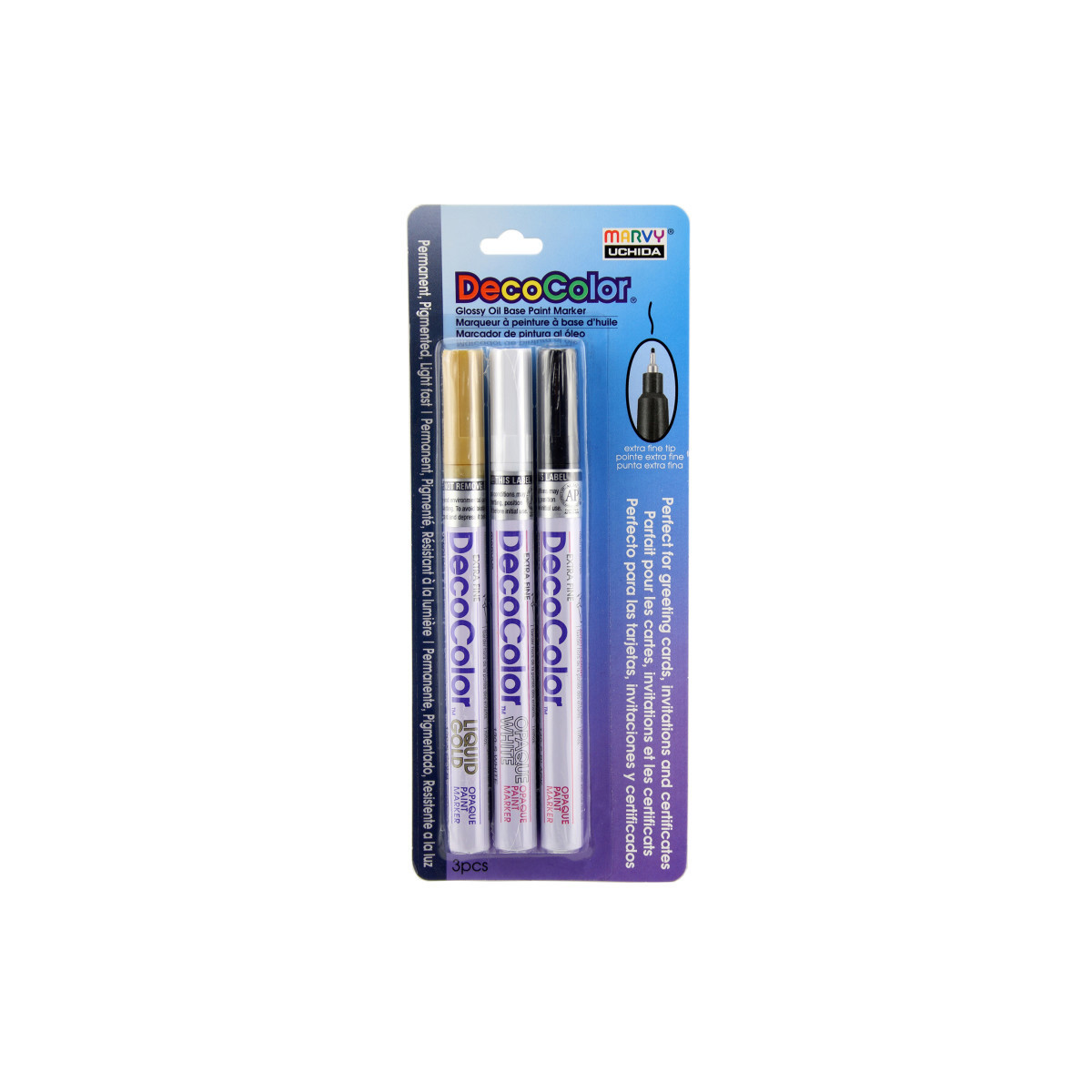 Create clean, permanent lines on a wide variety of surfaces with the DecoColor® Paint Marker, Extra Fine Tip, 1234-S, Set of 3 by Marvy Uchida®. This versatile marker features an extra fine point that delivers smooth, controlled application ideal for labeling, outlining, detailing, and decorative artwork. The oil-based, pigmented ink provides strong opacity, dries permanently, and remains lightfast for long-lasting color. It is acid free, weatherproof, and designed to cover most non-coated surfaces including glass, clay, wood, stone, porcelain, mirrors, metal, and paper. The durable formula includes xylene for enhanced adhesion and performance, making it suitable for indoor and outdoor projects where permanence is essential. Users should test the marker on an inconspicuous area first, as results may vary depending on surface type, finish, climate, and material composition. DecoColor® Fine Tip Paint Markers are ideal for artists, hobbyists, and makers who need crisp, reliable, permanent marks across multiple hard surfaces. Colors included: (1) Gold, (1) Black, (1) White.