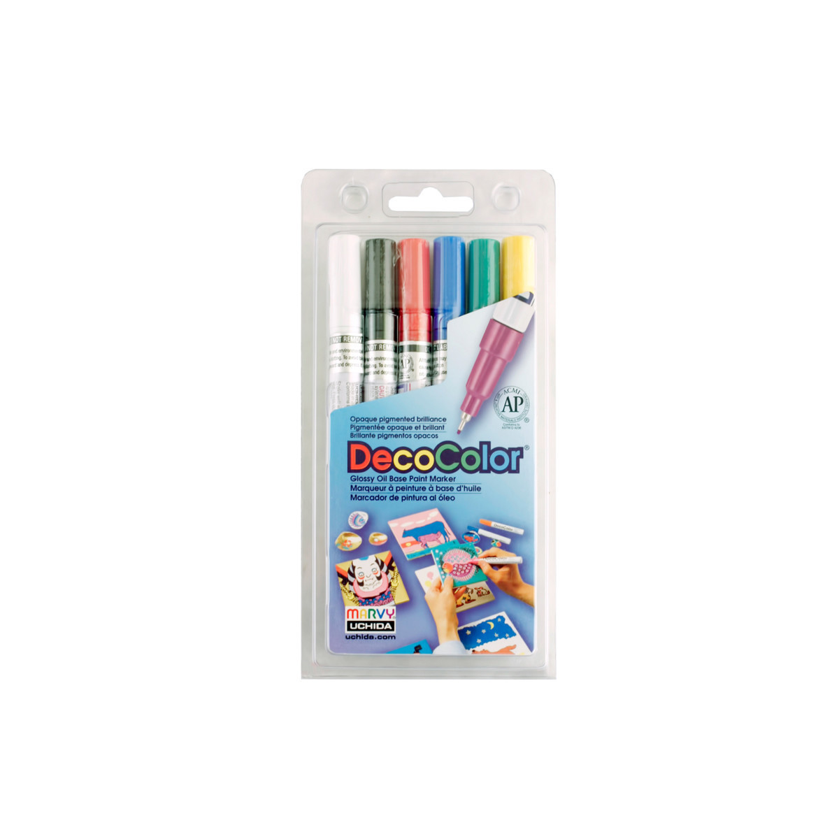 Create clean, permanent lines on a wide variety of surfaces with the DecoColor® Paint Marker, Extra Fine Tip, 1234-S, Set of 3 by Marvy Uchida®. This versatile marker features an extra fine point that delivers smooth, controlled application ideal for labeling, outlining, detailing, and decorative artwork. The oil-based, pigmented ink provides strong opacity, dries permanently, and remains lightfast for long-lasting color. It is acid free, weatherproof, and designed to cover most non-coated surfaces including glass, clay, wood, stone, porcelain, mirrors, metal, and paper. The durable formula includes xylene for enhanced adhesion and performance, making it suitable for indoor and outdoor projects where permanence is essential. Users should test the marker on an inconspicuous area first, as results may vary depending on surface type, finish, climate, and material composition. DecoColor® Fine Tip Paint Markers are ideal for artists, hobbyists, and makers who need crisp, reliable, permanent marks across multiple hard surfaces. Colors included: white, black, red, blue, green, yellow.